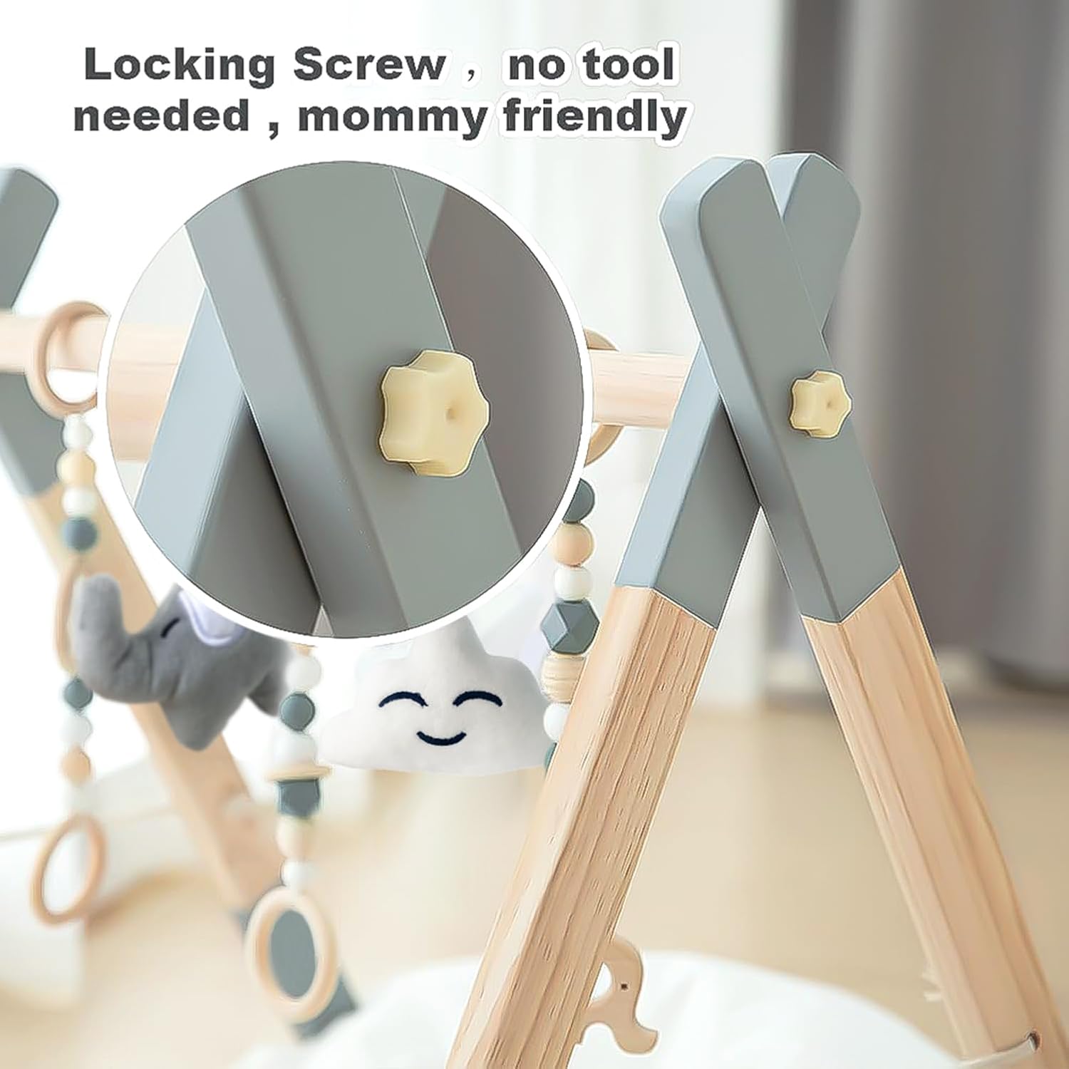 Wooden Foldable Baby Play Gym Frame Activity Hanging Bar With 5 Toys - Natural for Newborn (Grey)