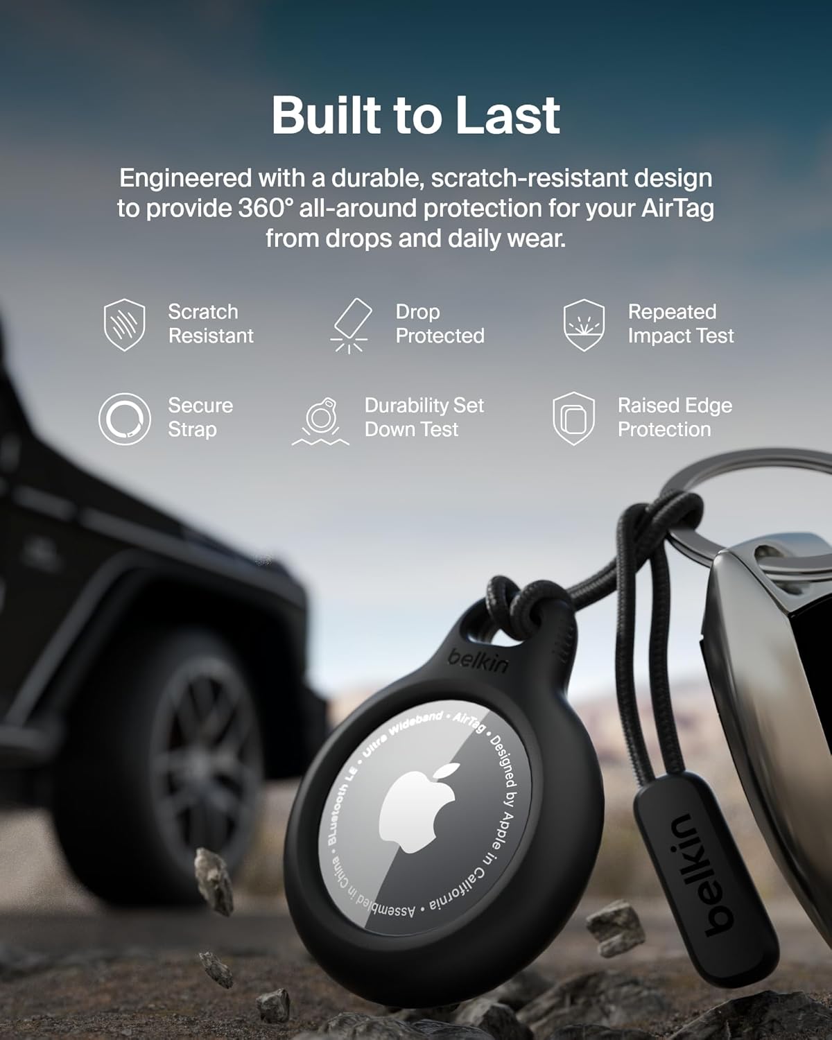 - THOUGHTFULLY DESIGNED: The Belkin AirTag case with strap firmly grips the edges of your AirTag while keeping personalized engravings visible in a high quality, elegant accessory