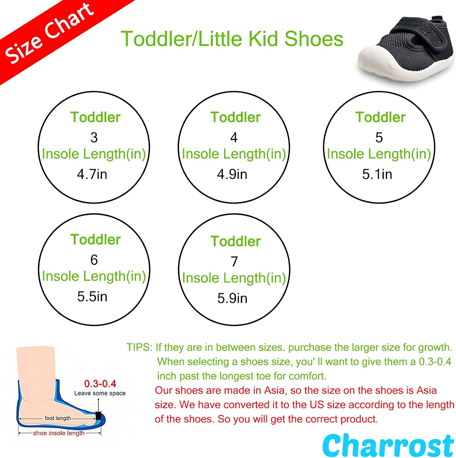 • Size,Suitable for 1-3 year-old children. US 3 Toddler: Insole length: 4.7 in(Tag size:14); US 4 Toddler: Insole length: 4.9 in(Tag size:15); US 5 Toddler: Insole length: 5.1 in(Tag size:16); US 6 Toddler: Insole length: 5.5 in(Tag size:18); US 7 Toddler: Insole length: 5.9 in(Tag size:20)