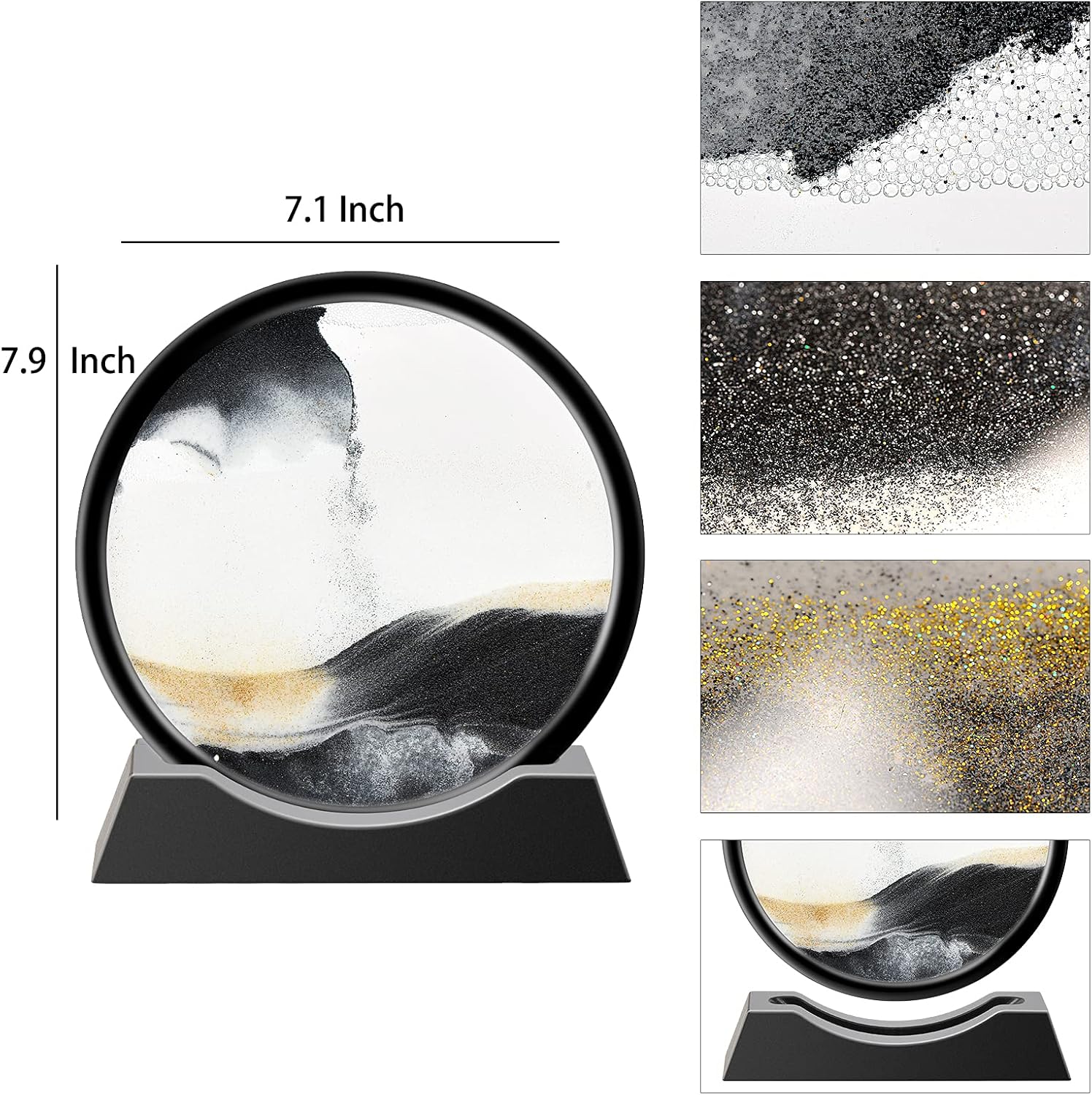 - ROUND GLASS FRAME: sand picture can be rotated 360°,Using new plastic frame, strong and durable, fresh and simple, beautiful and generous. When the glass cavity is upside down, the proportion of alumina and sand is different, and the buoyancy of bubbles is used to make alumina and sand sink into the cavity at different speeds, forming a layered and orderly