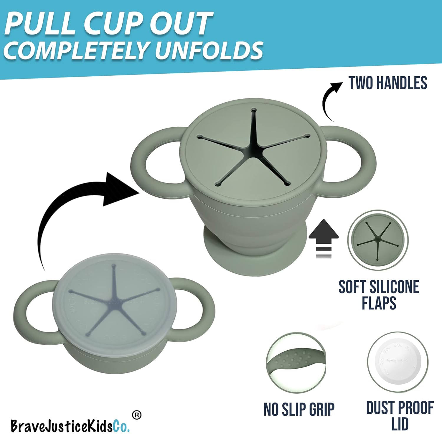 BraveJusticeKidsCo. | Snack Attack II Snack Cup | Collapsible Silicone Snack Container | Toddler and Baby Snack Catcher Lid (Desert Sage)