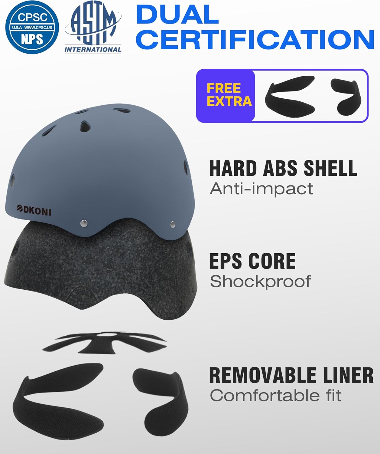 - CERTIFIED SAFETY HELMETS : Certified helmet passed CPSC1203,ASTM1447 and CE1078 safety helmet standards,DKONI helmets (Hard ABS shell+US EPS material foam+removable hot pressed inner linings,lightweight and sturdy ) provide kids/youth/adults with both comfort and impact resistance when enjoy multi-sports