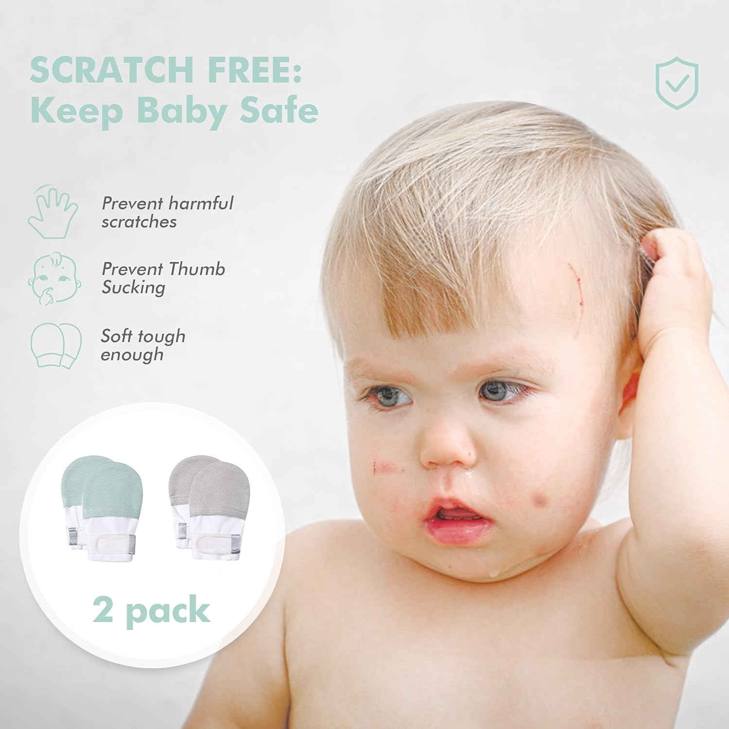 - [No Scratch: Keep Baby Safe]: These Anti Scratch Baby Mittens are designed to prevent harmful scratches & thumb sucking, also a big help with things such as Eczema, Dry Itchy Skin, Pulling hair, NG Feeding Tube and Squeezing during Breastfeeding