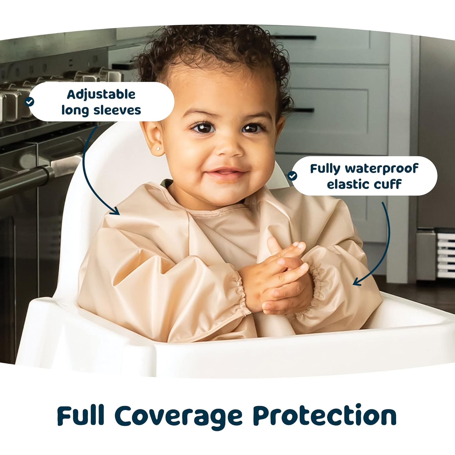 - SAFE SMOCK Designed for baby-led weaning (6-24 months) and toddler use (2-4 years), our OEKO-TEX certified smock bib combines BPA-free polyester with 360° waterproof sleeves to block spills and mess. Machine-washable for daycare reuse. Most parents pair it with our WET BAG (sold separately) for mess-proof essentials. Whether you need toddler bibs or BLW supplies for baby, our bib is a safe and stylish choice.