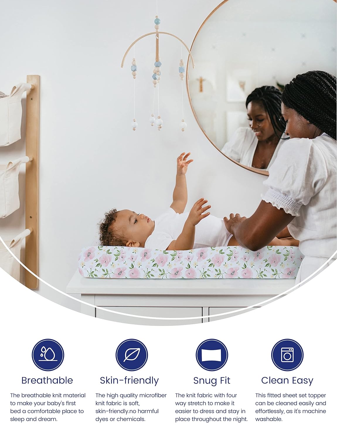TotAha Premium Stretchy Changing Pad Covers (2-Pack) Hypoallergenic, Silky Comfort, Buttery Soft, Calming Effect, All-Season Jersey-Knit 5'' Deep Pocket(Meredith Allover Floral & Pale Pink Flowers)
