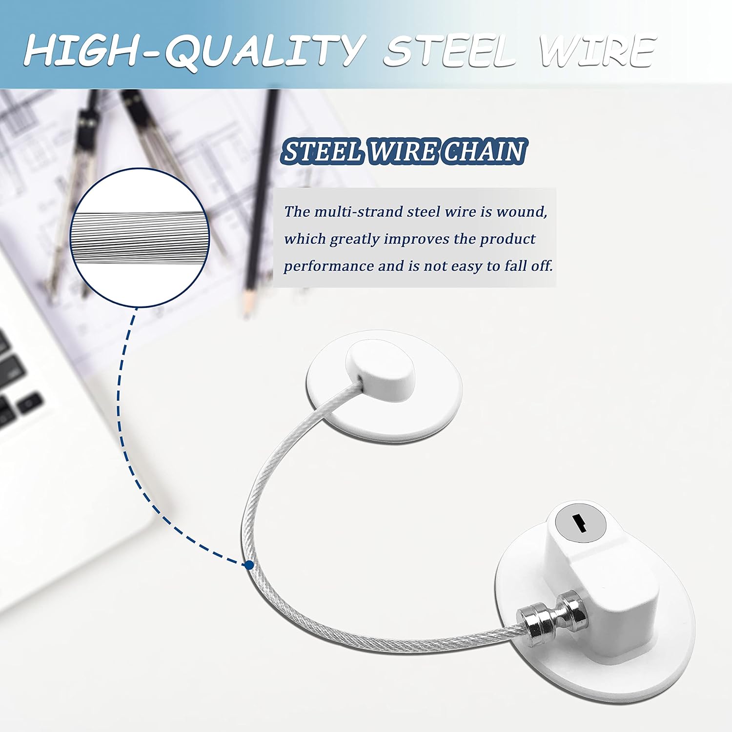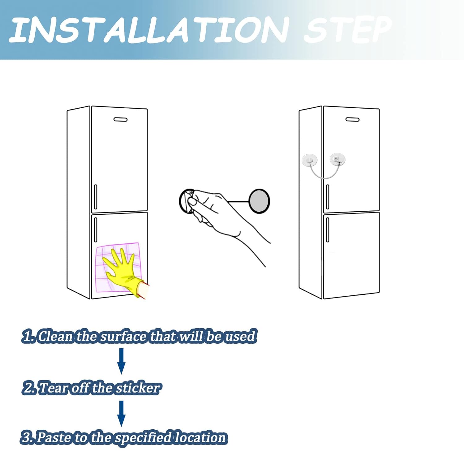 - 【UPGRADED VERSION OF THE HIGHEST QUALITY】 our refrigerator lock is equipped with high-quality large adhesive pad (2.7 inches x 2.7 inches), which is tested to be very strong and can be reused for many times. The refrigerator lock shell is made of ABS plastic material, 304 stainless steel lock cylinder, and the cable surface is electro galvanized alloy, which does not drop paint and is durable.