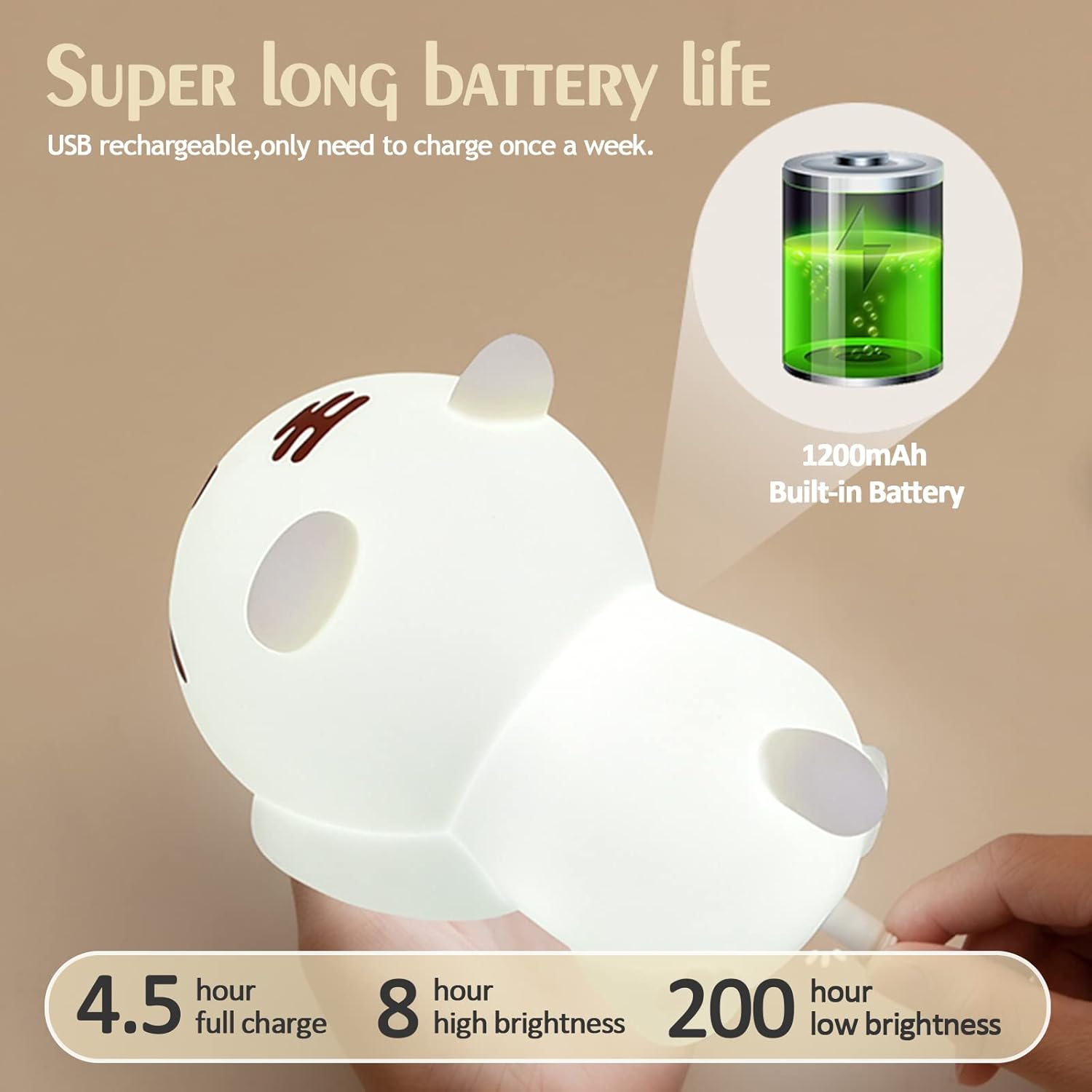 - 🎠1200mAh Rechargeable Battery: 100 hours with sleeping light, long battery life, small size and big energy, just needs to be charged with an adapter (5V-1A) or usb device for 4.5 hours but can work for continuous lighting over 8 hours in high brightness or 200 hours in low brightness. no problem to open all night, sleep peacefully with power saving.