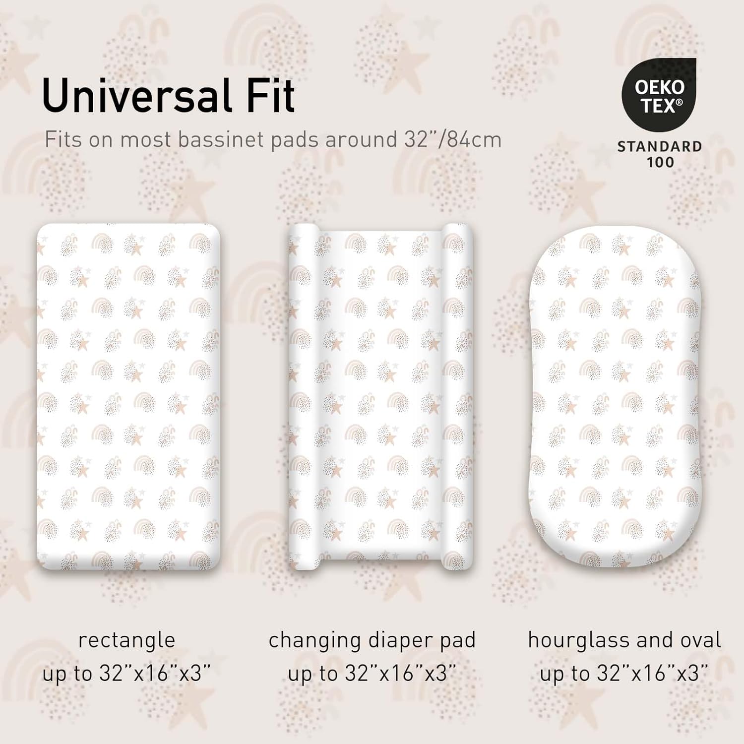 - ONE SIZE FITS ALL (32"X16"X3"): Classic universal size. Not too big, not too small, smooth and snug to fit almost all bassinets, loungers, cradles, and co-sleepers' standard, oval, round, rectangle, and hourglass-shaped mattresses