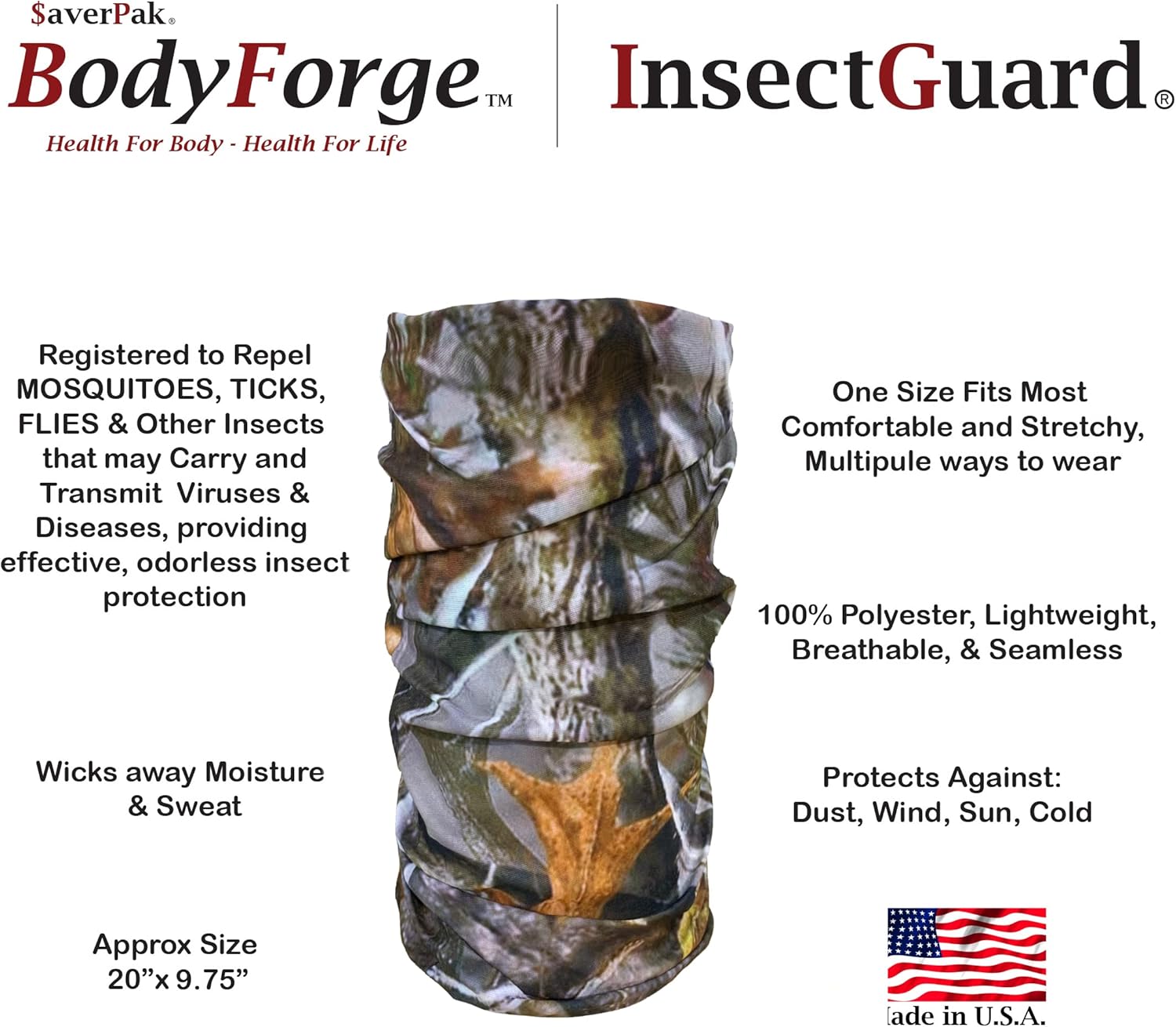 $averPak BodyForge & InsectGuard Permethrin Treated Mosquitoes, Flies, Ticks & More Insect Repellent Tube Bandanna Neck Gaiter Headband (Camouflage)