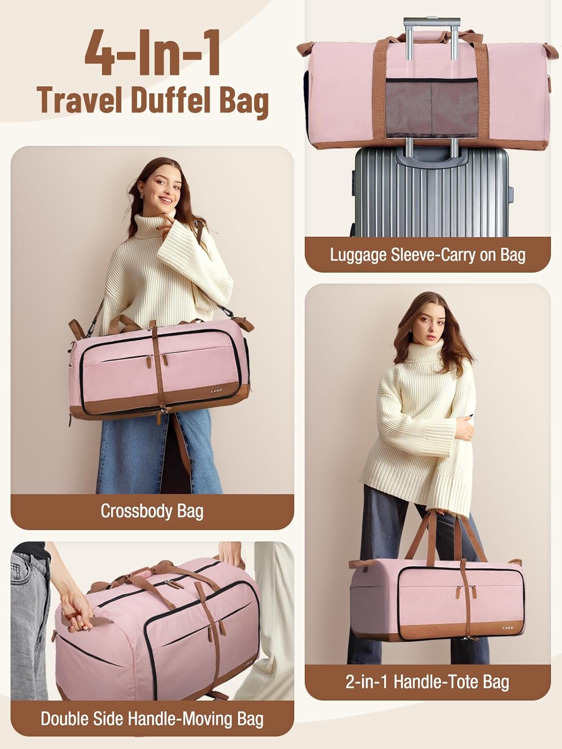 Lekesky Foldable Travel Duffel Bag for Women, 80L Large Duffle Bag with Separate Shoes Compartments & Straps, Carry On Weekend Bag for Women, Hospital, Overnight(Pink)