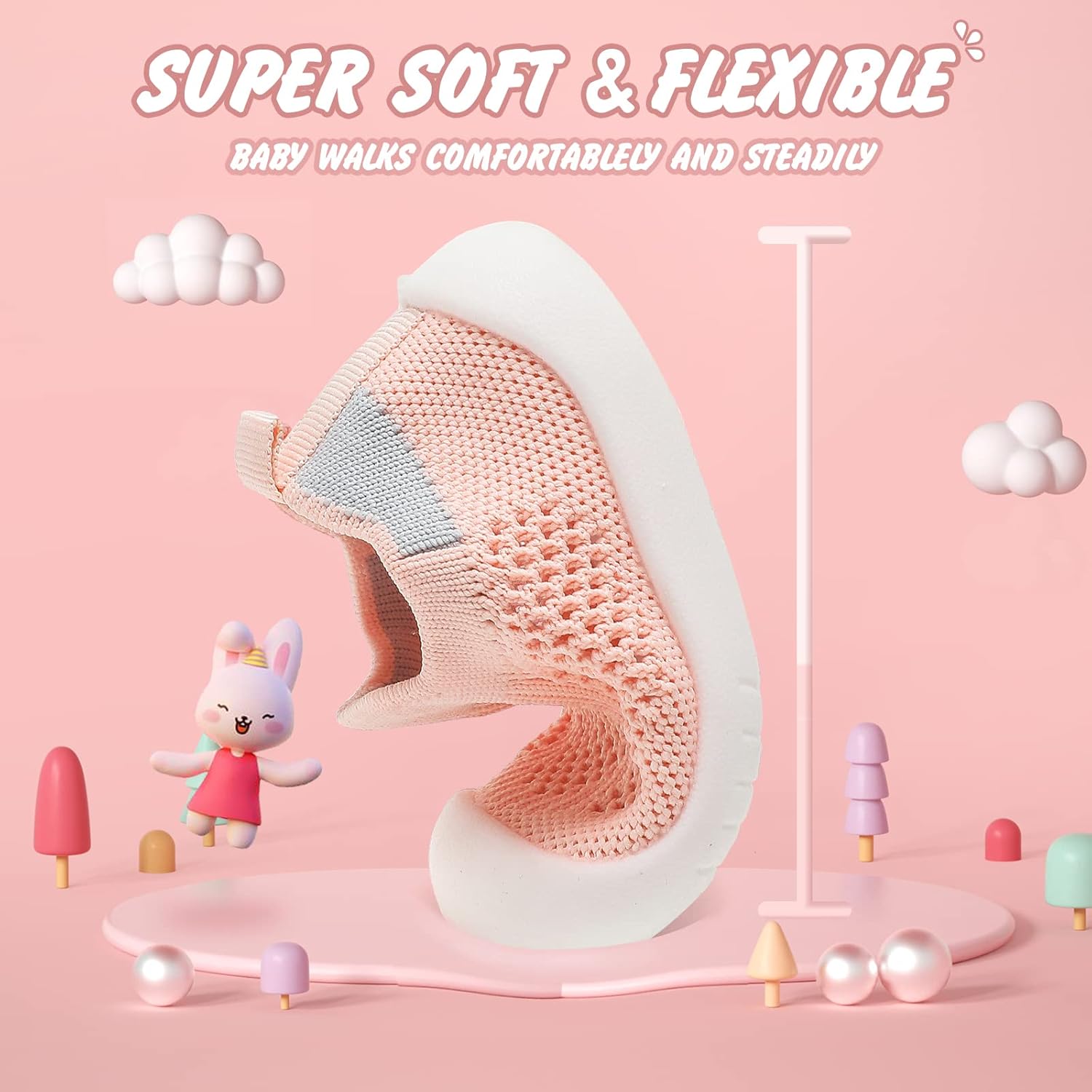 • Soft & Comfortable :The upper features a soft new upgraded one-piece knit fabric,which can make the baby feel soft even without socks.The sole adopts a 1/3 scientific bending design, which just fits the bending of a 1-4 year old baby's foot when walking, making it easier to exert force and help easy learning to walk. A pair of comfortable shoes brings kids a pleasant walking and running experience.