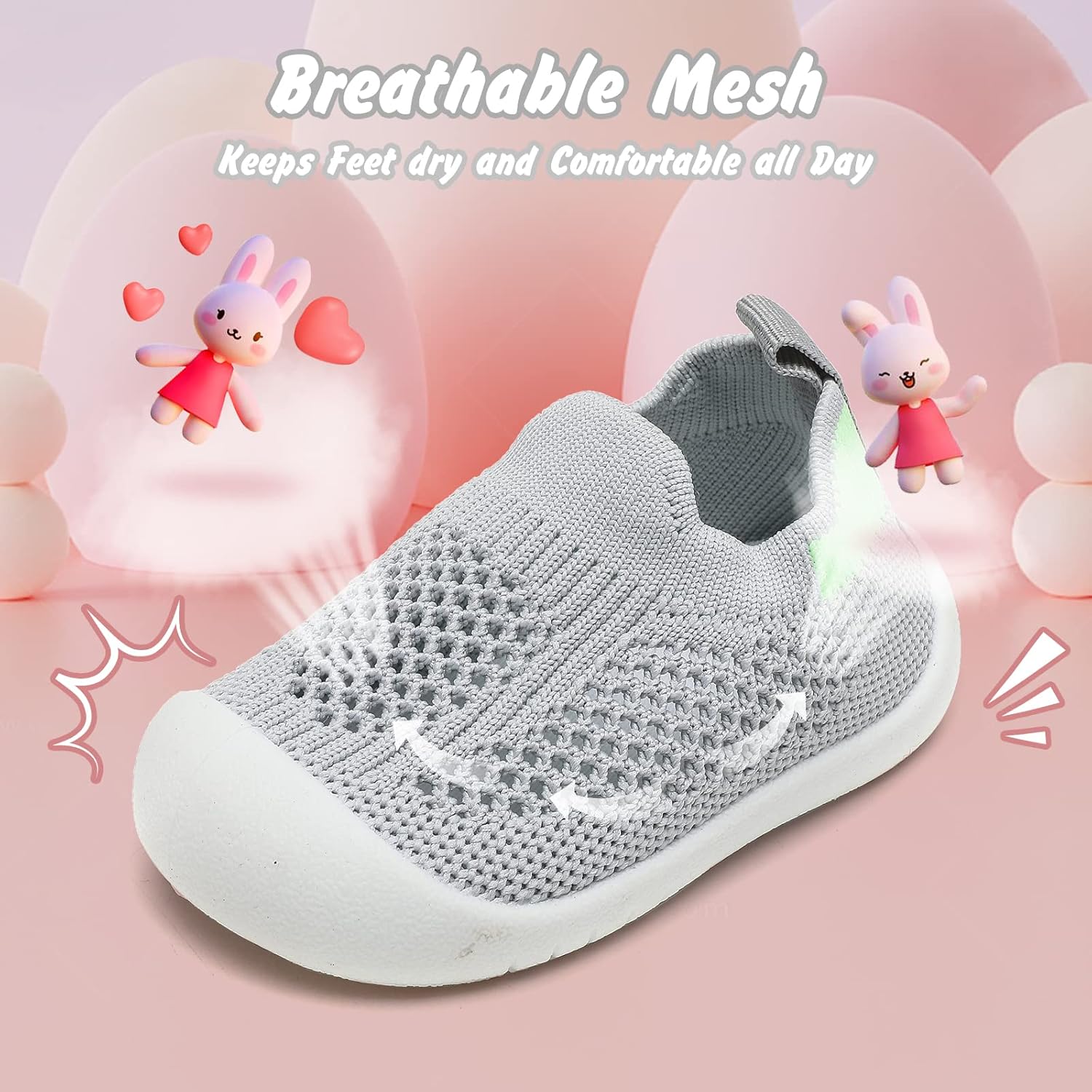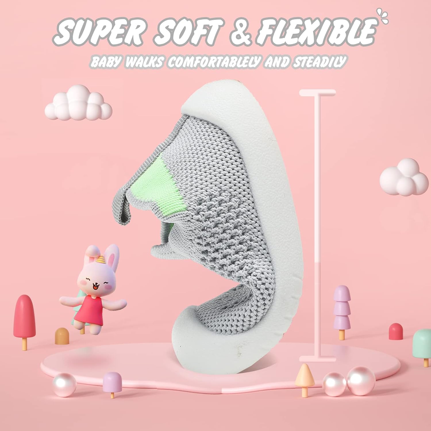 - Soft & Comfortable :The upper features a soft new upgraded one-piece knit fabric,which can make the baby feel soft even without socks.The sole adopts a 1/3 scientific bending design, which just fits the bending of a 1-4 year old baby's foot when walking, making it easier to exert force and help easy learning to walk. A pair of comfortable shoes brings kids a pleasant walking and running experience.