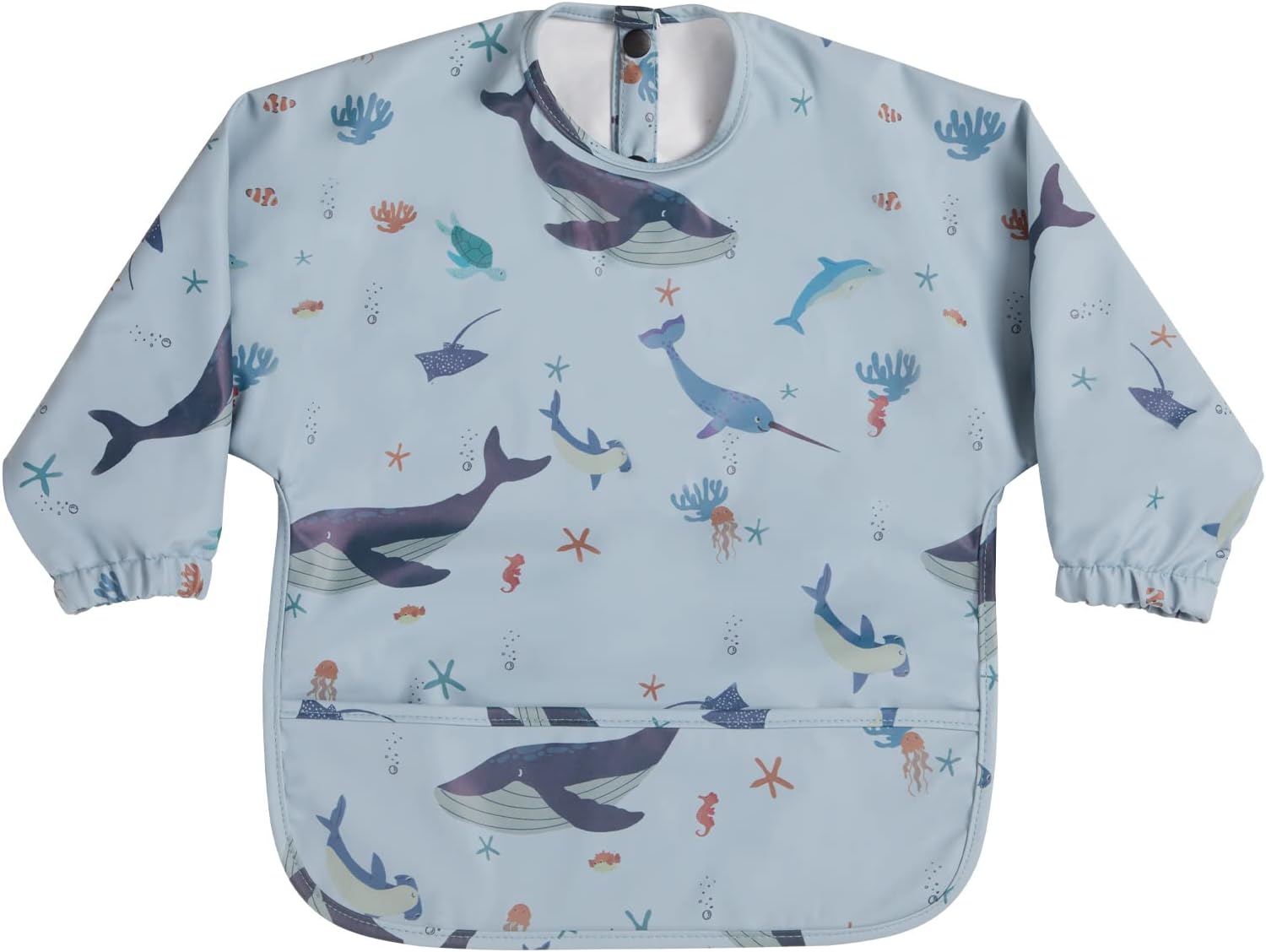 - Pack & Travel Well: Our baby smock bib for eating can be neatly folded up and accommodated in the tiniest of places in your diaper bag or a handbag. Avoid getting food stains on your baby’s clothes with this baby apron bib. The reinforced hook & loop closure makes it easy to put on, but hard for the baby to take the sleeved bib off.. Say no to dirty baby clothes and buy this stylish baby coverall bib! With a pocket to catch at least some of what didn't make it into children's mouth