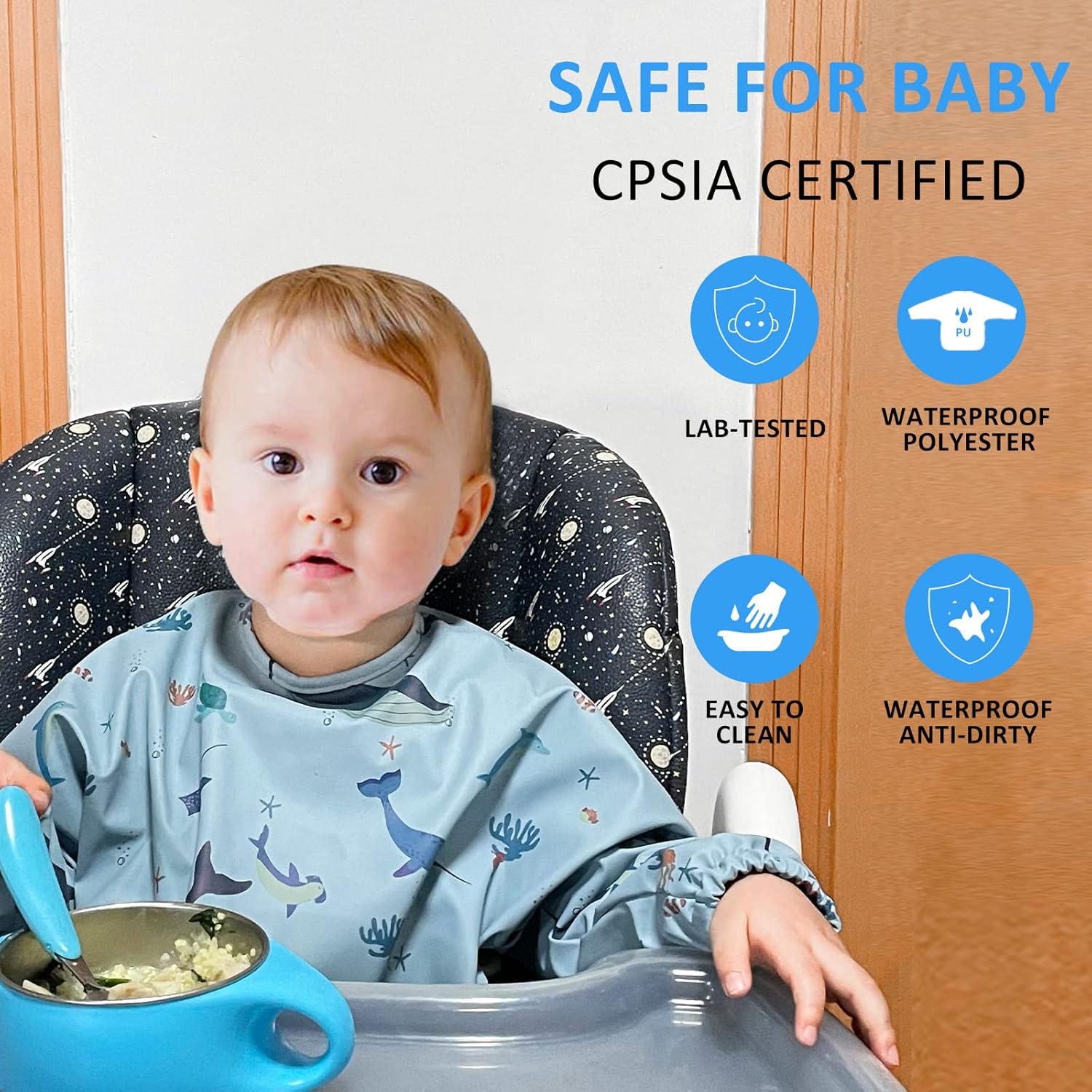 - Keeping Baby Clean & Saving Cleaning Up Time : The baby bib with sleeves for eating is full coverage & long sleeve design. Our baby eating bib not only keeps baby clean but keeps the highchair clean as well! This toddler smock bib is waterproof, stain-resistant, oil-resistant. Don't get worried about the mess, it's just easy to get all the food and stains form it. Our waterproof baby bibs saves you so much clean up time. Making meals and hands on activities less of a hassle