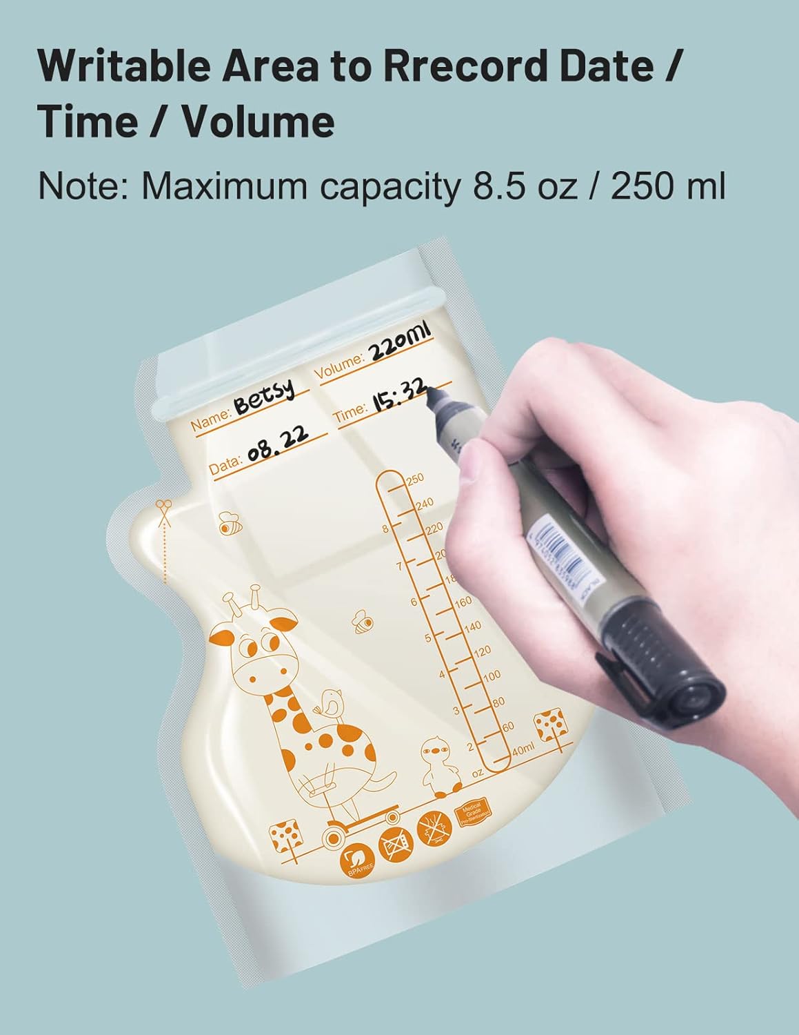- 【Write Area to Record Storage and Use】The breast milk storage contains a label and volume scale, you can record important information such as name, volume, date, time, etc. for safer storage and use. (Mumgaroo milk storage bags can hold up to 250ml / 8.5oz breast milk)