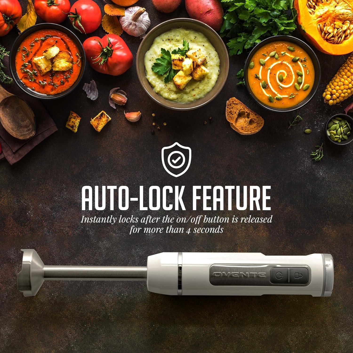 OVENTE Cordless Immersion Hand Blender, Rechargeable Handheld Portable Stick Mixer with 8 Mixing Speed Option, One-Touch Control and Stainless Steel Blades for Smoothies, Shakes or Soups, White HR781W