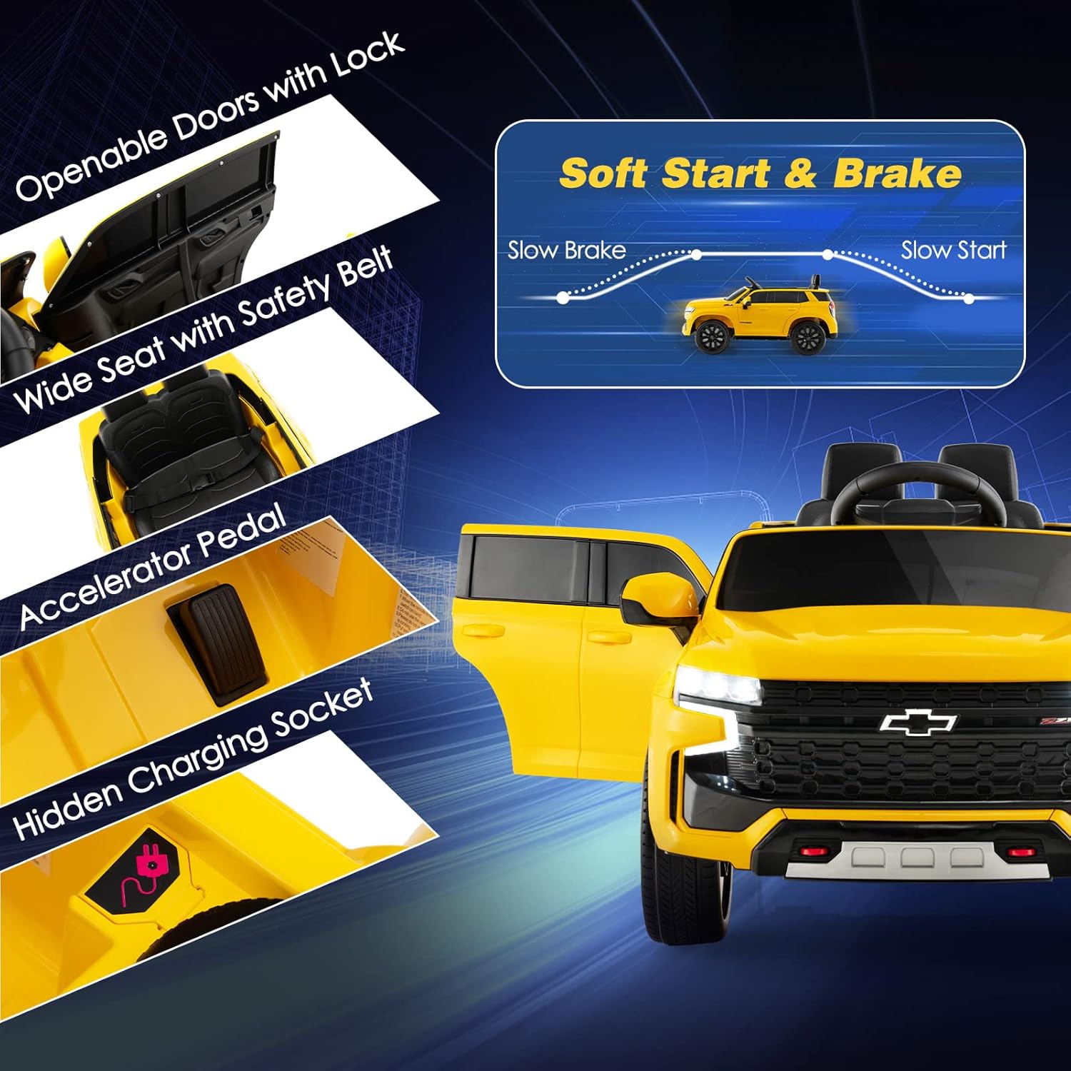 - Stunning Appearance & Light Effect: The kids car looks like a real version of Chevrolet Tahoe SUV, providing luxury car experience for young drivers. Once start the vehicle, children must be surprised by fantastic headlights, taillights and lighted dashboard.