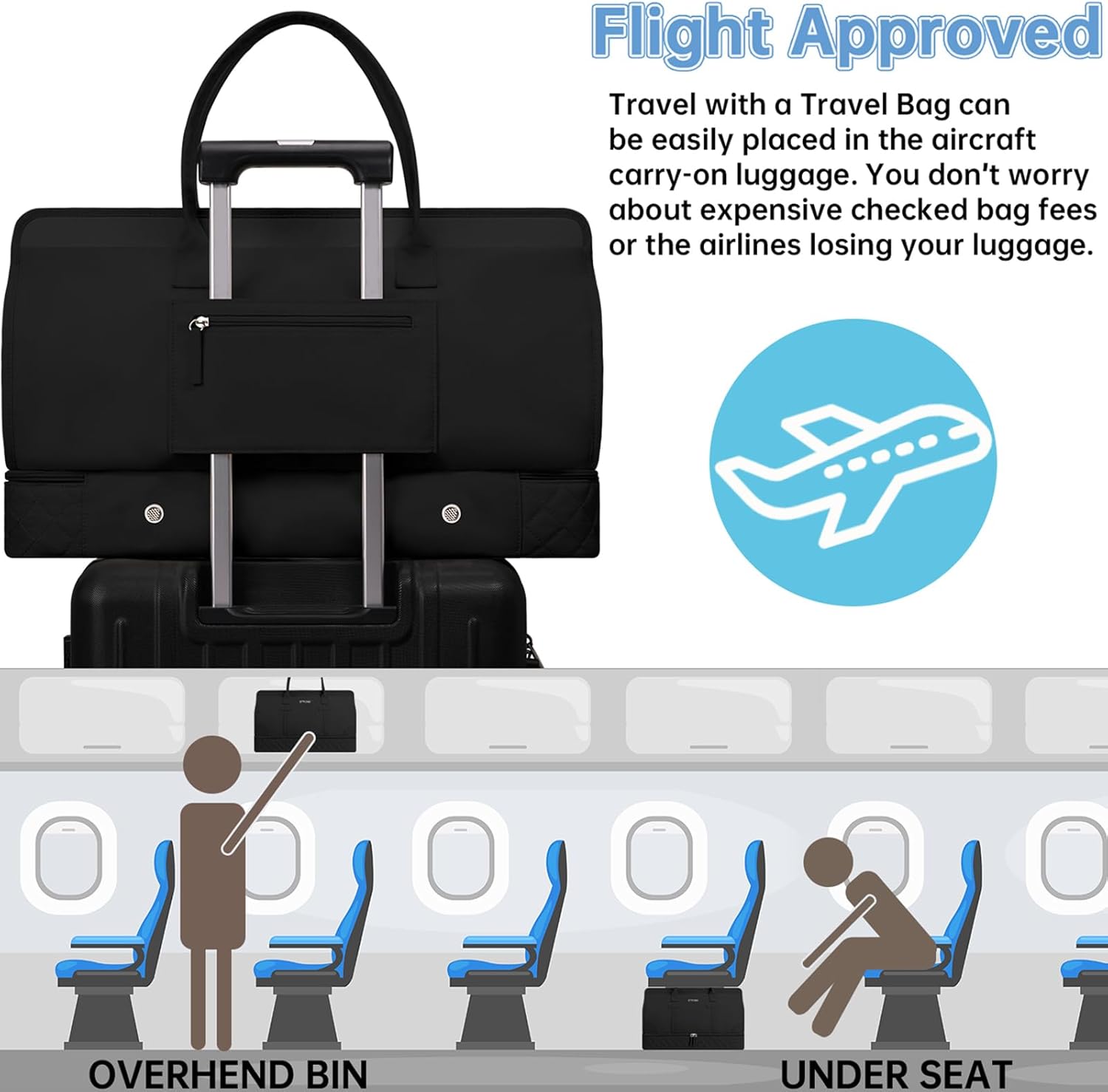 - Carry on Bags for Airplanes: Large Size (H*W*L) 47x23x31cm/18.5*9*12'', ETRONIK duffle bag meets most international carry-on requirements. Take this carry on bag as personal items in flight, you can put it in the overhead compartment as well as the under seat. The luggage strap design makes this bag can be setted on your roll-away luggage, this overnight weekend boarding bag is perfect for your personal travel