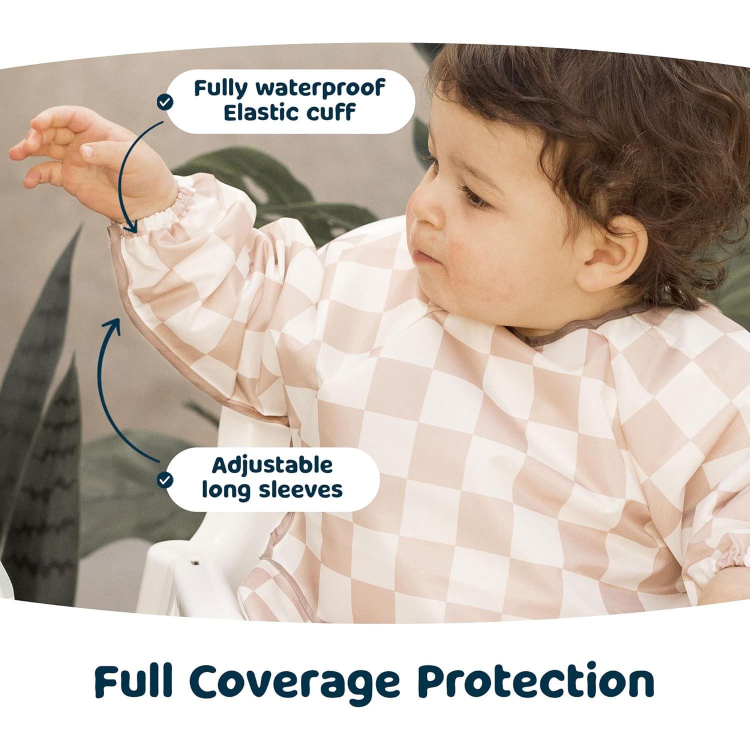 Tiny Twinkle Mess Proof Baby Bib,Waterproof Smock Baby Bib for Eating,Machine Washable Long Sleeve Bib,Baby Led Weaning,Toddler Bib,BLW Supplies(Checkers Brown, Small 6-24 Months)
