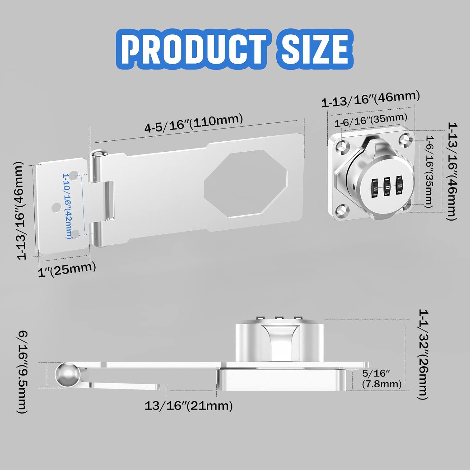 - Size: The combination cabinet lock measures 4-5/16" (110 mm) x 1-3/16" (46 mm) x 1-1/32" (26 mm) (L*W*H)