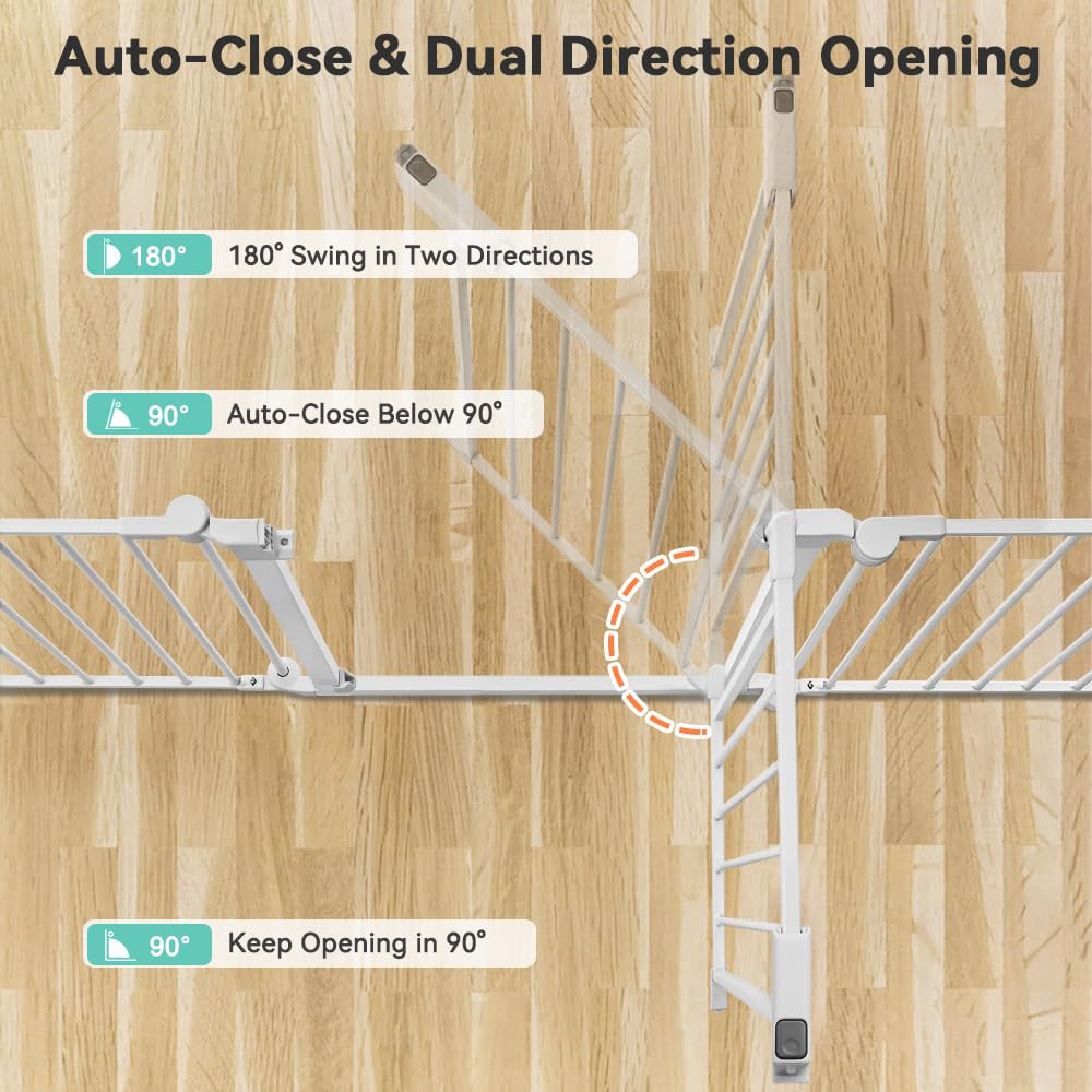 - Auto Locking & Double Safety: Our baby gate features a double-locking mechanism that locks both at the top and bottom. Simply press the button and lift it with one hand to unlock. It's easy for adults but challenging for children and pets. The dog gate automatically closes when the opening angle is less than 90°, and the door can swing in dual directions