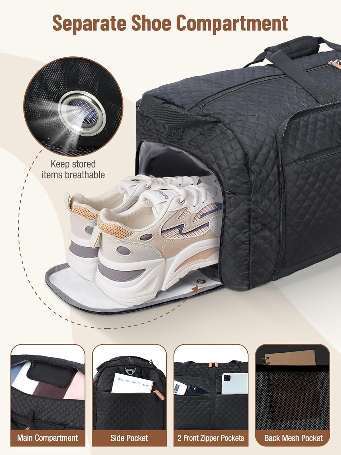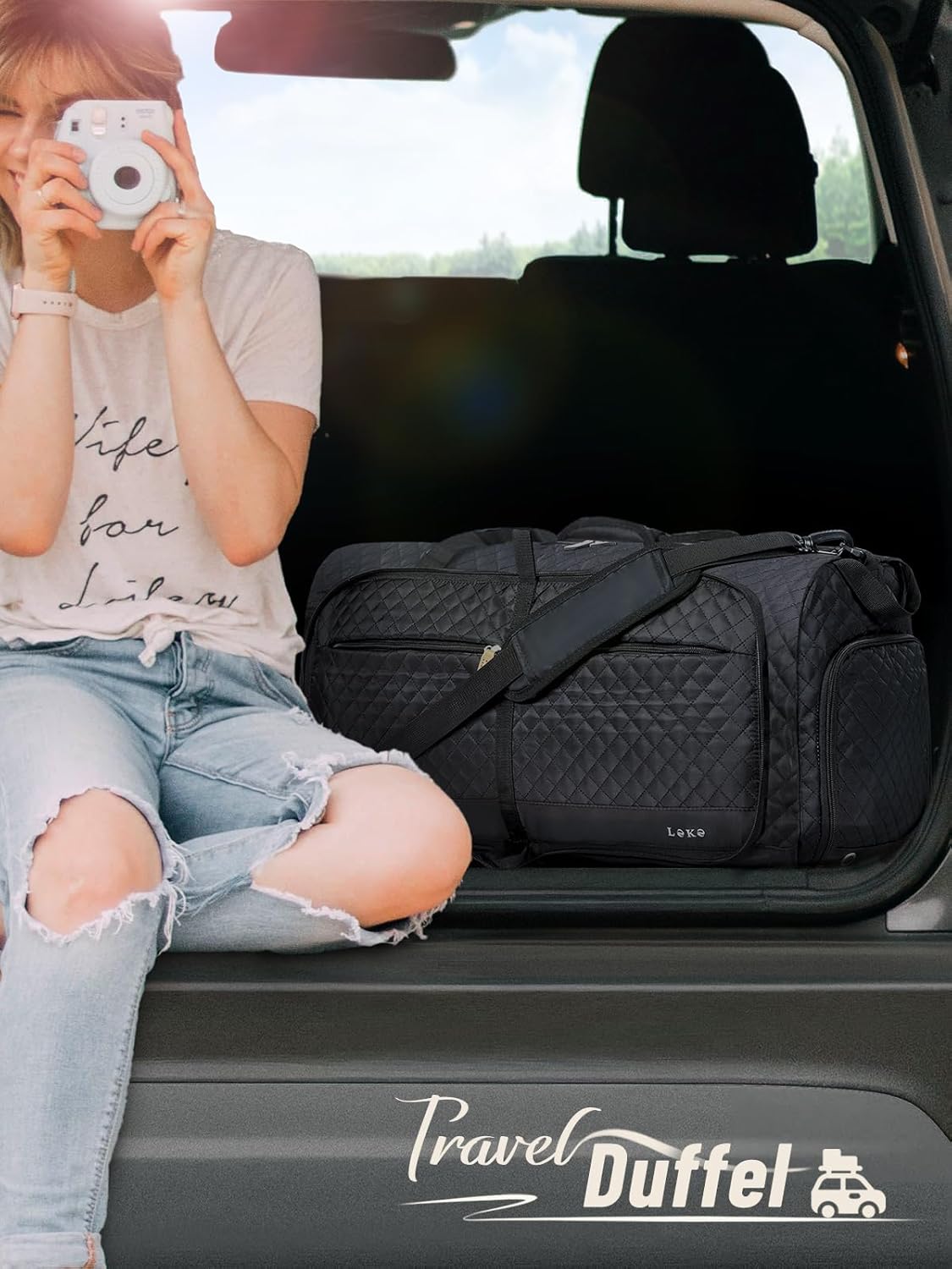 Lekesky Foldable Travel Duffel Bag for Women, 80L Large Duffle Bag with Separate Shoes Compartments & Straps, Carry On Weekend Bag for Women, Hospital, Overnight(Black Quilted)
