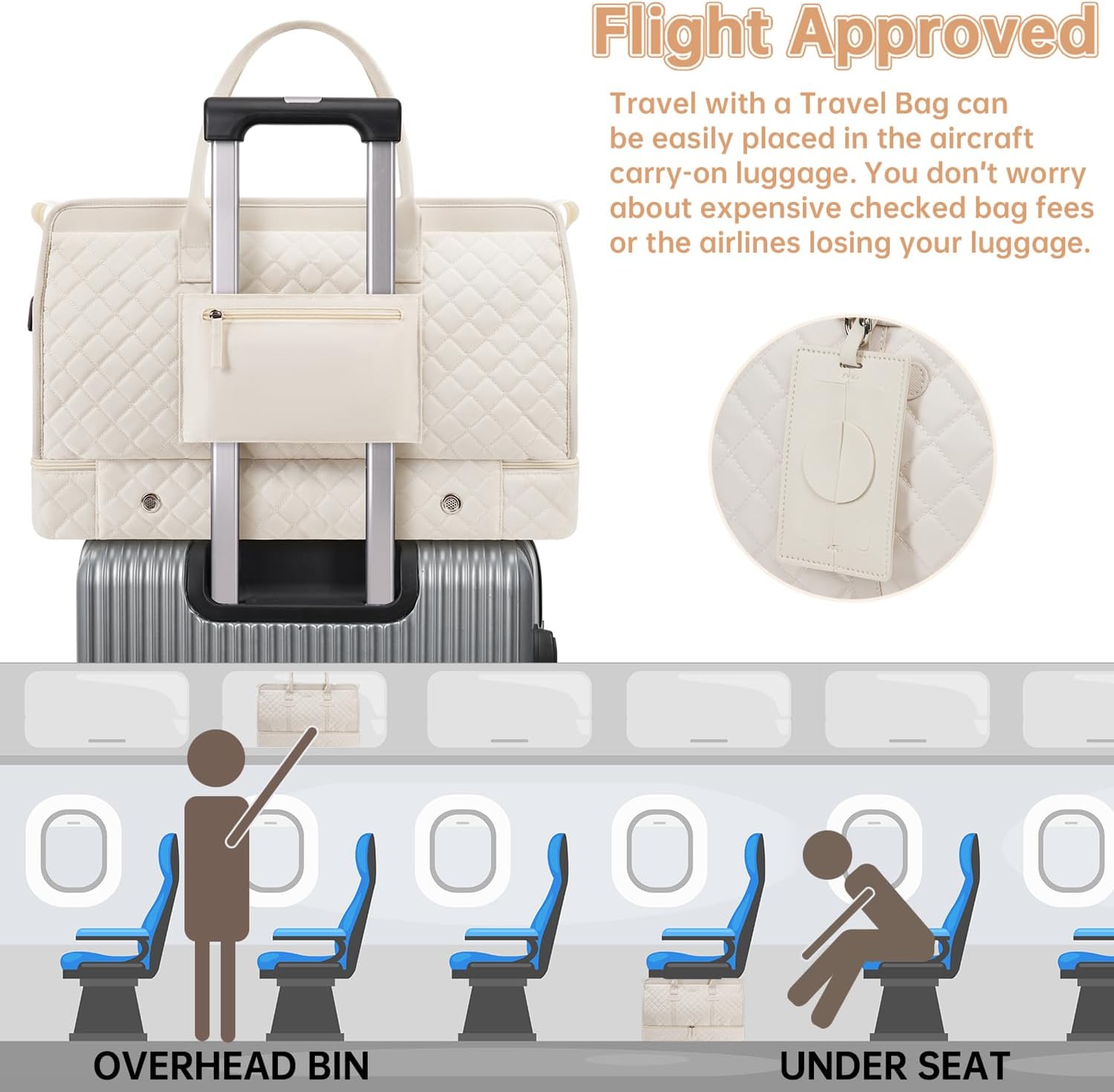 - Large Size Travel Bag for Women: The personal item travel bag featuring multiple pockets and compartments for stuff organization, roomy space can fit in 2-3 days of travel essentials, easily fit into your clothes, toiletries, shoes, laptop and other items. In the back of the duffle bag there is a pocket for easy access your smart phone, IDs or passport. Equipped a built-in USB charging port, perfect for charging your phone or other devices while travel