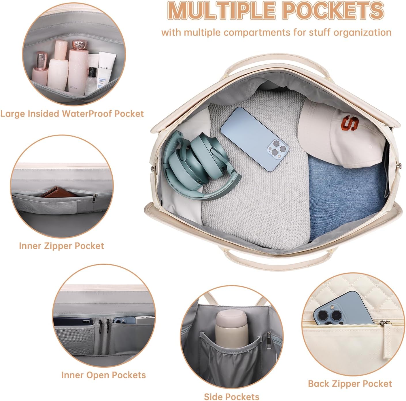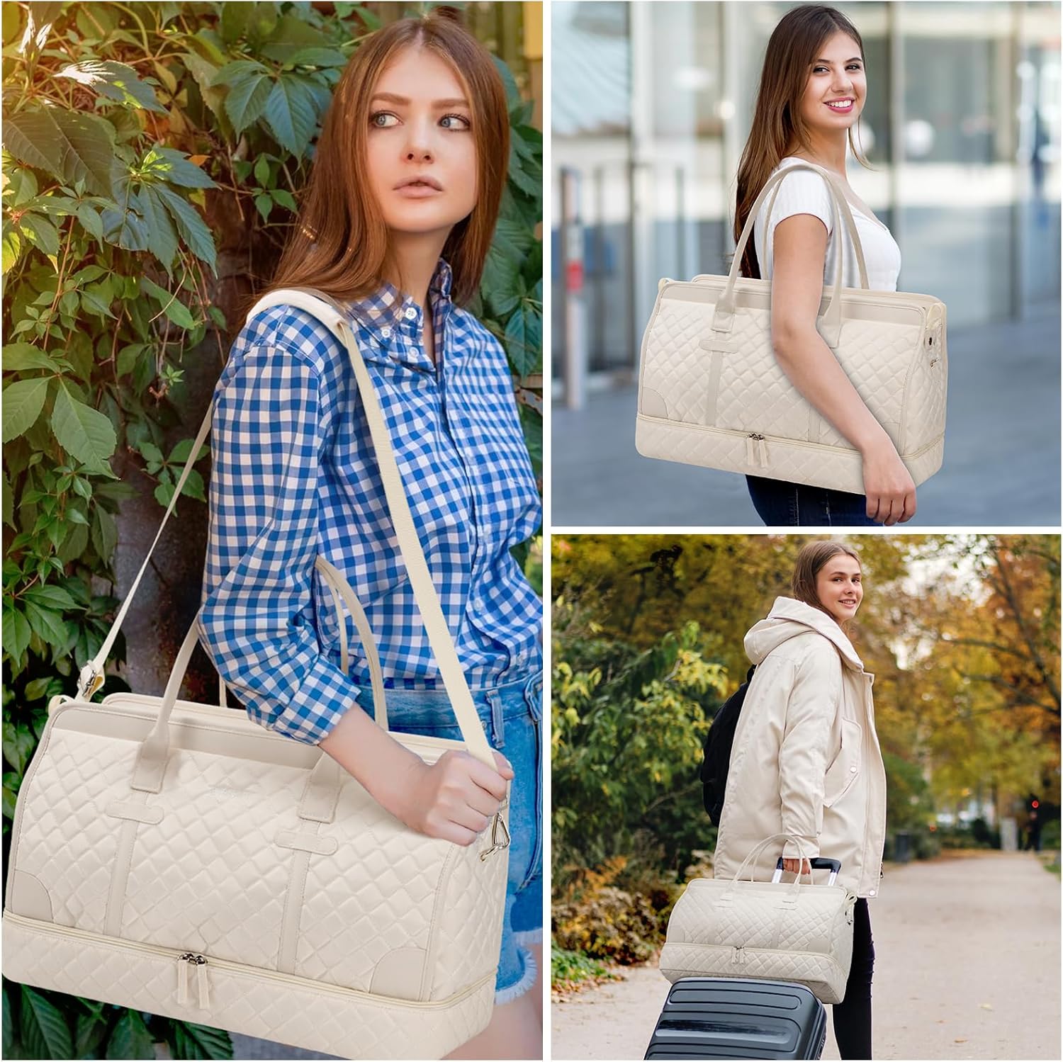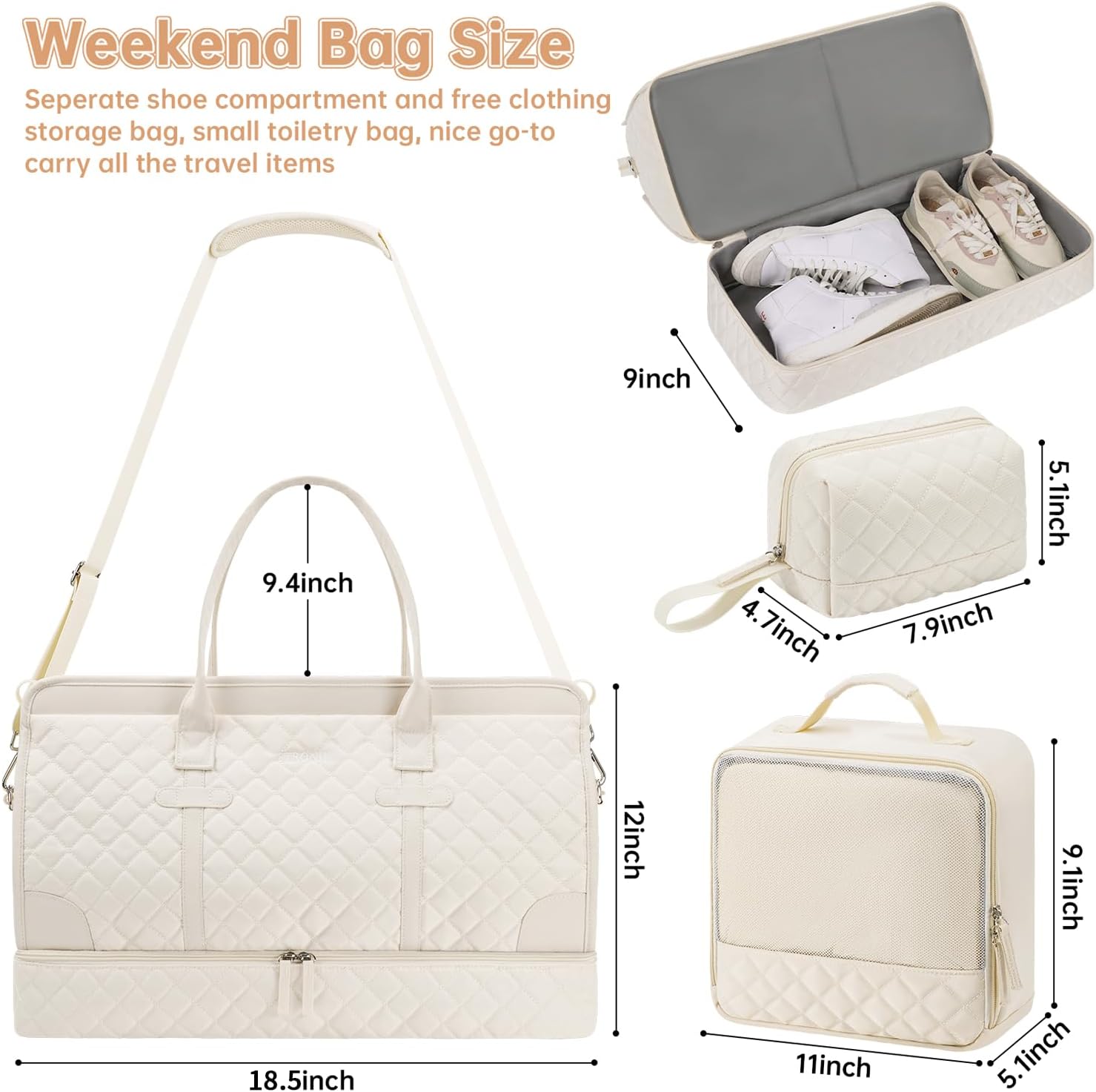 ETRONIK Weekender Overnight Bag for Women, Large Travel Duffle Bag with Shoe Compartment & Wet Pocket, Carry On Tote Bag Gym Duffel Bag with Toiletry Bag for Hospital 3 Pc Set, Large Size, Off-white