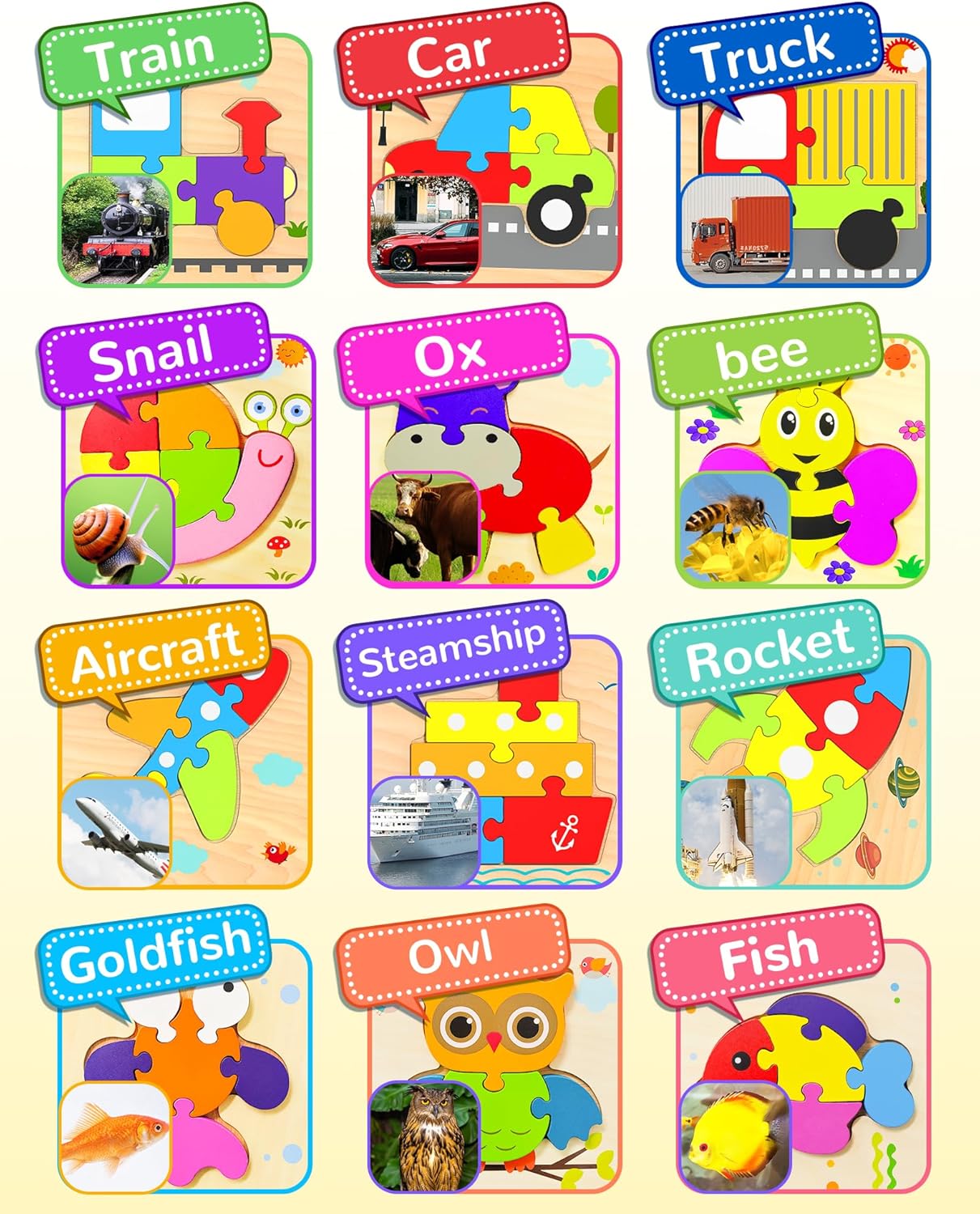 Yetonamr Wooden Toddler Puzzles Gifts Toys for 1 2 3 Years Old Boys Girls, 12 Vehicle Shape Montessori Toy Educational Blocks Kids Toys Gift Baby Learning Toy Age 1-3, 2-4