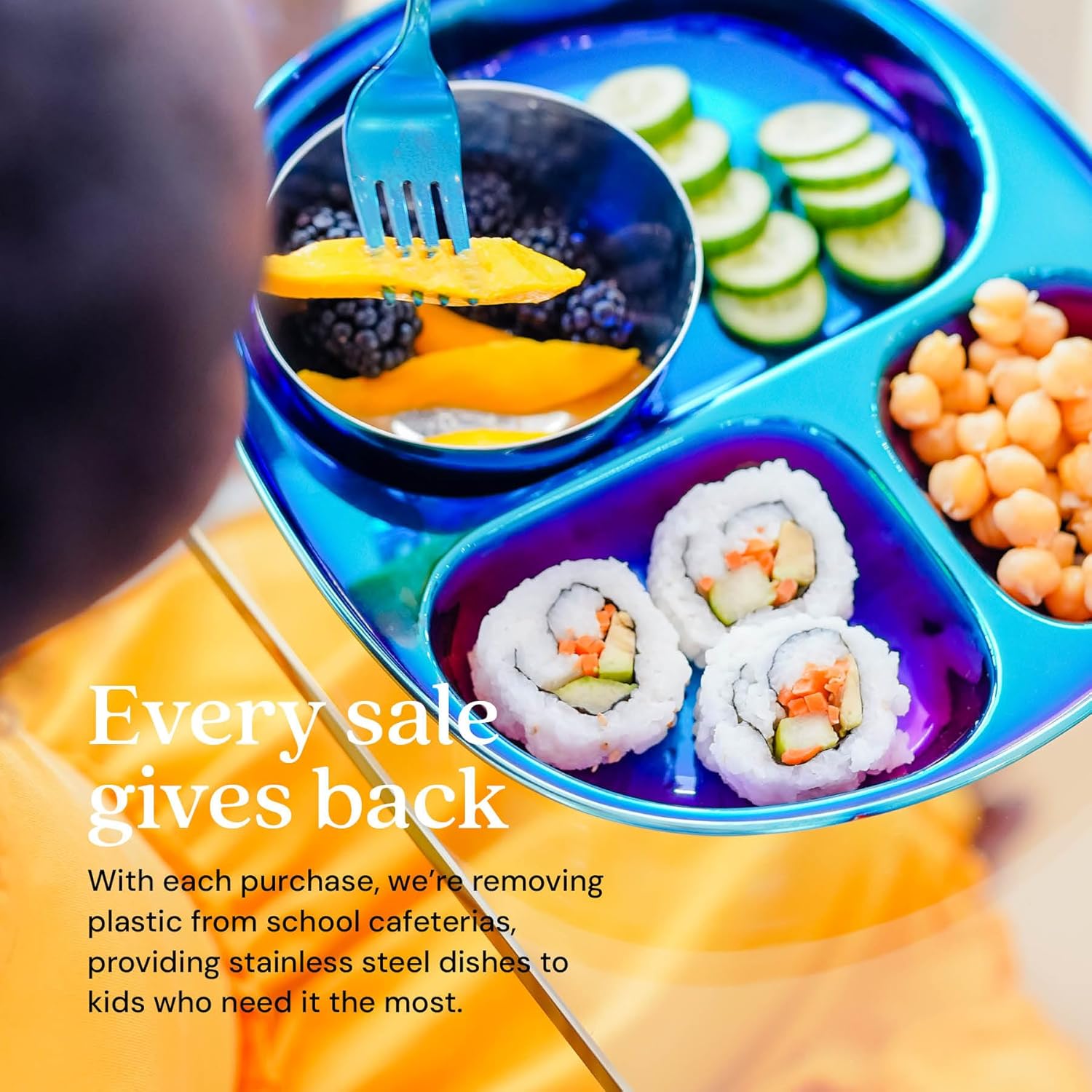 - Kid Approved — Ahimsa Mindful Mealtime Sets make mealtime fun with vibrant and colorful stainless steel kids plates that children adore. Included is a stainless steel toddler plate with dividers, a 8 oz. kids stainless steel cup and small baby bowl, and kids silverware (1 kid fork, 1 kid spoon).