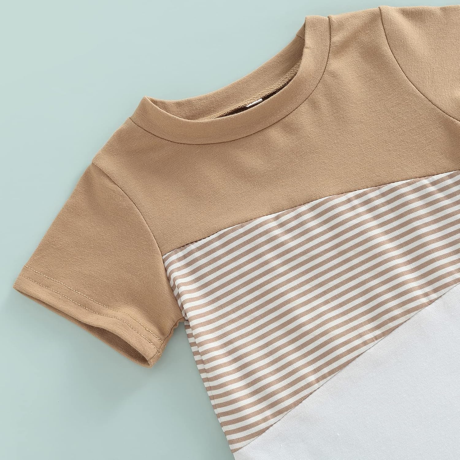 • Relax Crew Neck, One Pocket Front, Striped Pattern, Comfy Short Sleeve T Shirts Tee Tops, Elastic Waist with Drawstring Shorts, Side Pockets, Comfy and Cute Newborn Baby Boys Summer Outfits Clothes