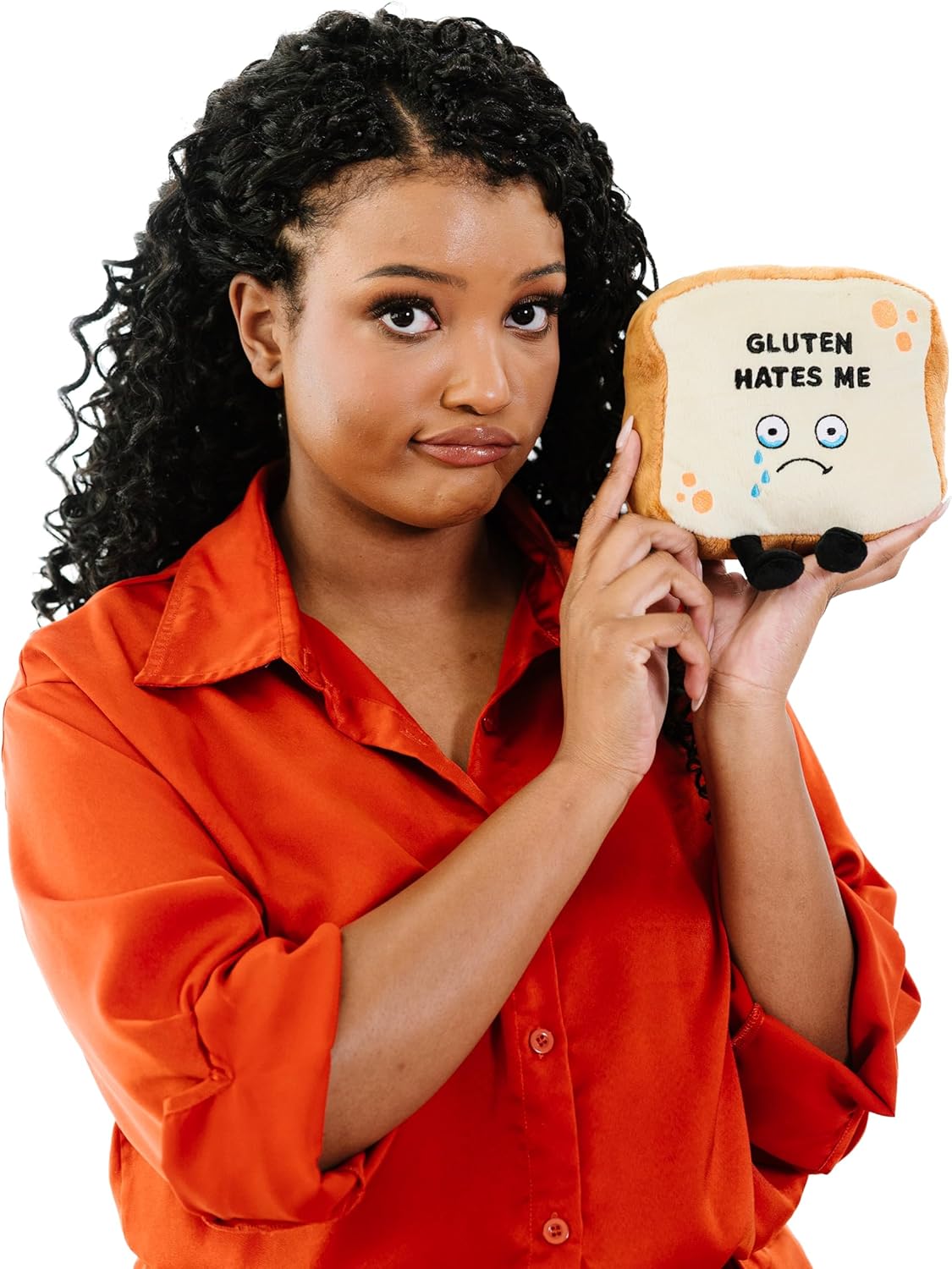 Gluten Hates Me Foodie Plushie, Funny Pun Meme Gag Gift, White Elephant, Stocking Stuffer Present, Great for Emotional Support, Fun Desk Accessory, Weighted Base for Display