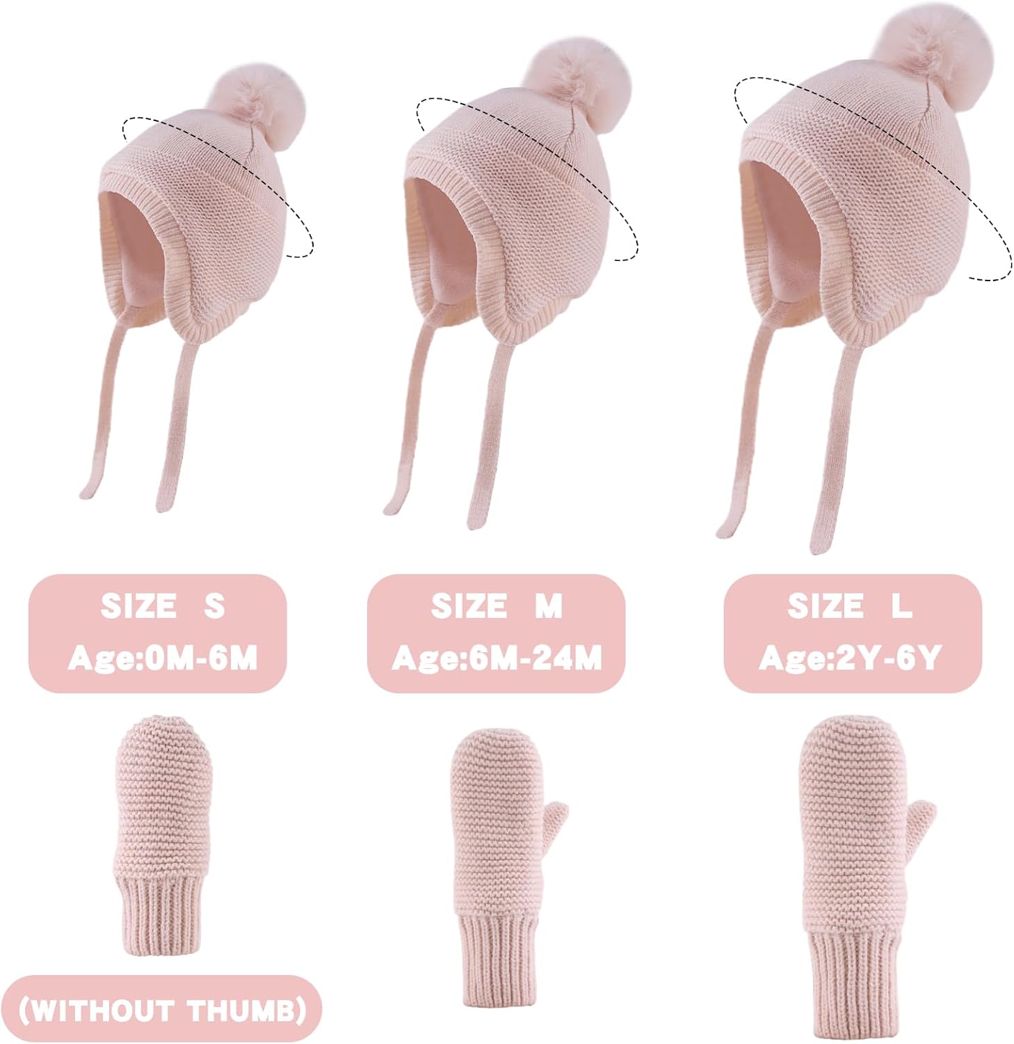 - SIZE CHART: Our children's beanie hats with pom and mittens set comes in 3 different sizes. The small size is suitable for infants aged 0-6 months, the medium size is perfect for toddlers aged 6-24 months, and the large size is designed for kids aged 2-5 years old. The fleece-lined fabric of the hat provides excellent stretch and heat retention, allowing each size to accommodate a wide range of ages. Please take note that the gloves of small size without thumb holes.