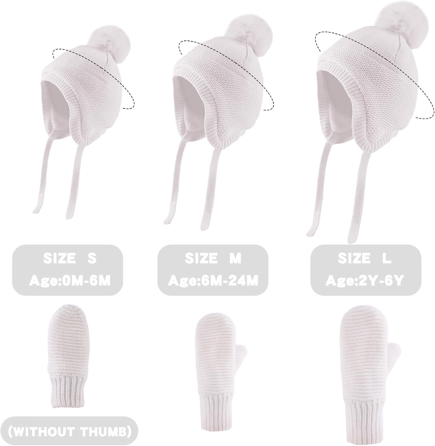 • SIZE CHART: Our children's beanie hats with pom and mittens set comes in 3 different sizes. The small size is suitable for infants aged 0-6 months, the medium size is perfect for toddlers aged 6-24 months, and the large size is designed for kids aged 2-5 years old. The fleece-lined fabric of the hat provides excellent stretch and heat retention, allowing each size to accommodate a wide range of ages. Please take note that the gloves of small size without thumb holes.