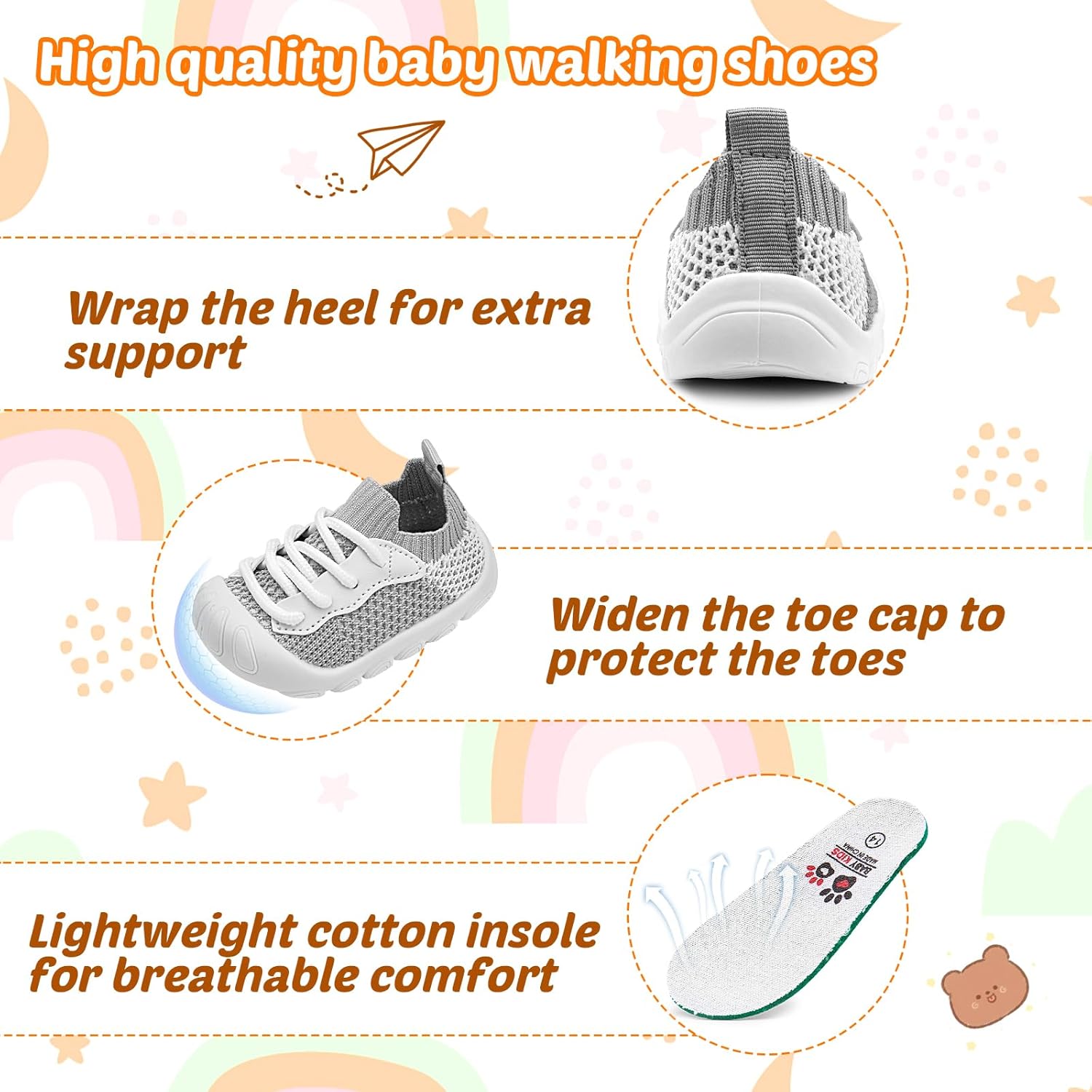 • Step into versatility with our Toddler Shoes, designed for both indoor play and outdoor exploration. Crafted from premium, safe knit, they offer a cozy hug for little feet. Engineered with scientific foot support, they're perfect for learning to walk, running, exercising, or playing anywhere. From crawling indoors to big adventures outside, these shoes inspire confidence with every giggly step.
