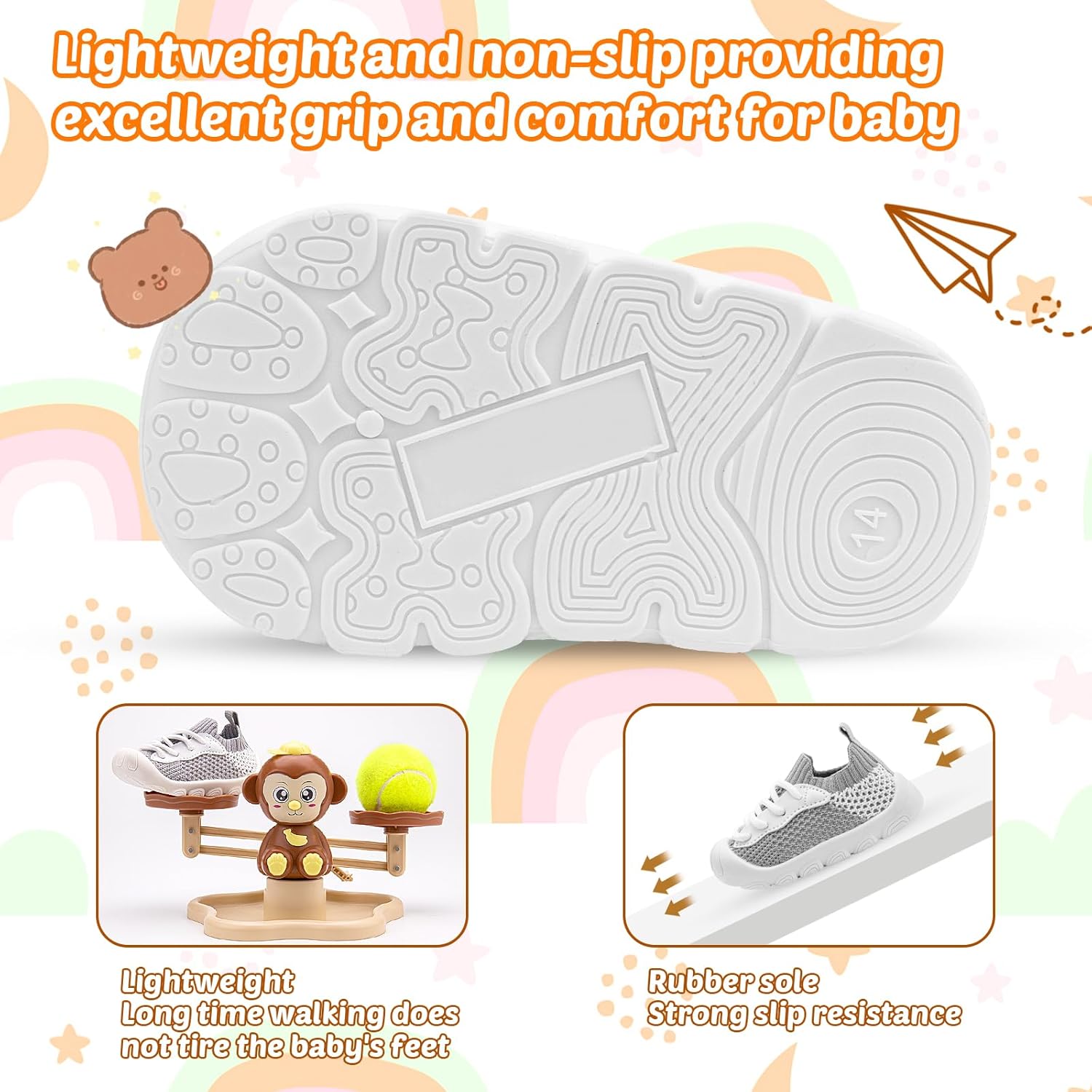 • Tip: If your baby's feet are chunky, we recommend choosing insoles that are 0.2 to 0.4 inches longer than their feet. If your baby's feet are thin, choose insoles that are 0.1 to 0.2 inches longer than their feet. To ensure the correct size, please measure the baby's feet before purchasing. Our shoes are made in Asia, so the sizes on the shoes are Asian sizes. Based on the length of the shoe, we have changed it to an American size. So you will get the right product.