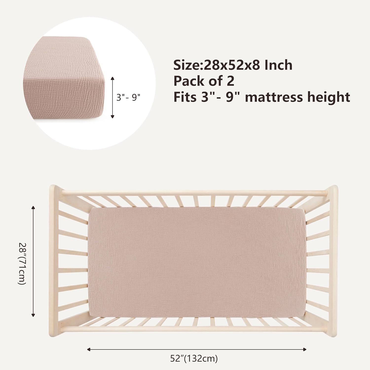 - PERFECT FIT - Featuring a 360° elastic band and 9" deep pockets, our muslin crib sheets hug your crib mattress securely. Sized at 52" x 28" (133 X 71 cm), they're compatible with the majority of standard crib and toddler bed mattresses.