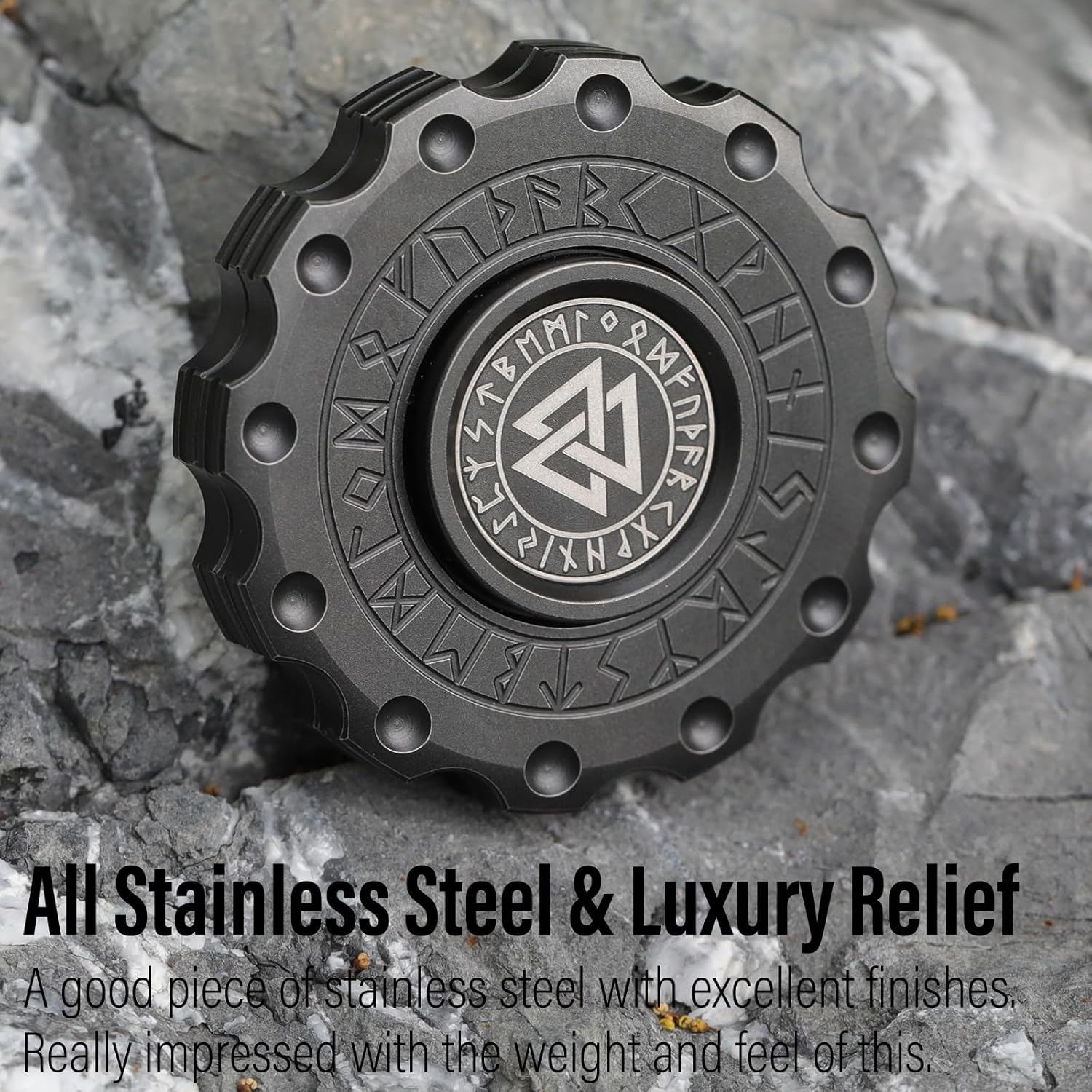 - [Viking Looking] Viking Pirate fidget spinner megnetic slider design from viking pirate culture. Each side engravings with symbols or numbers, you could utilize it for memory practice, a random number generator, and something that could serve as a coin flip or dice roll outcome. Fingertips are cool lasered with mysterious symbols. It's visually appealing for sure. The circle of dots in gear edge, making it more friction force to push.