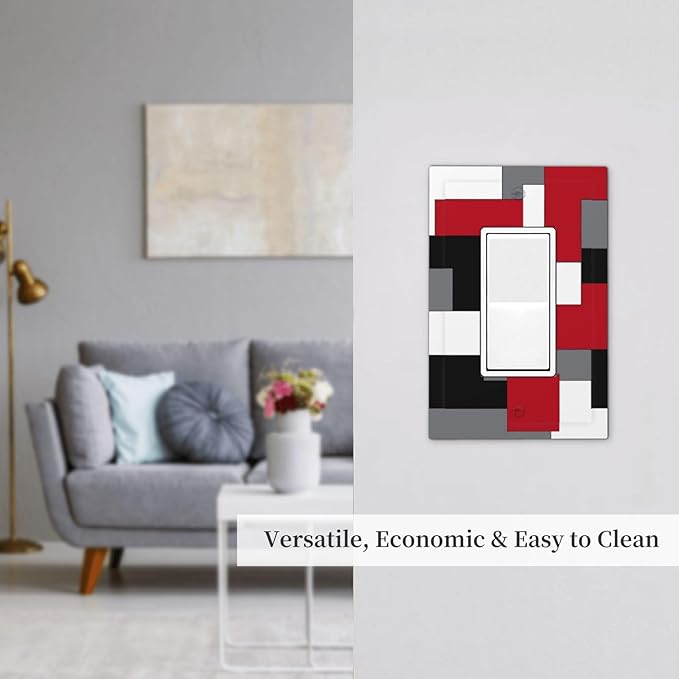 1 Gang Single GFCI/Decorator Rocker Outlet Light Switch Wall Plate Cover Modern Abstract Red Black Grey Gray White Geometric Plaid Middle Mid Century Decorative One Device Electrical Faceplate Dimmer