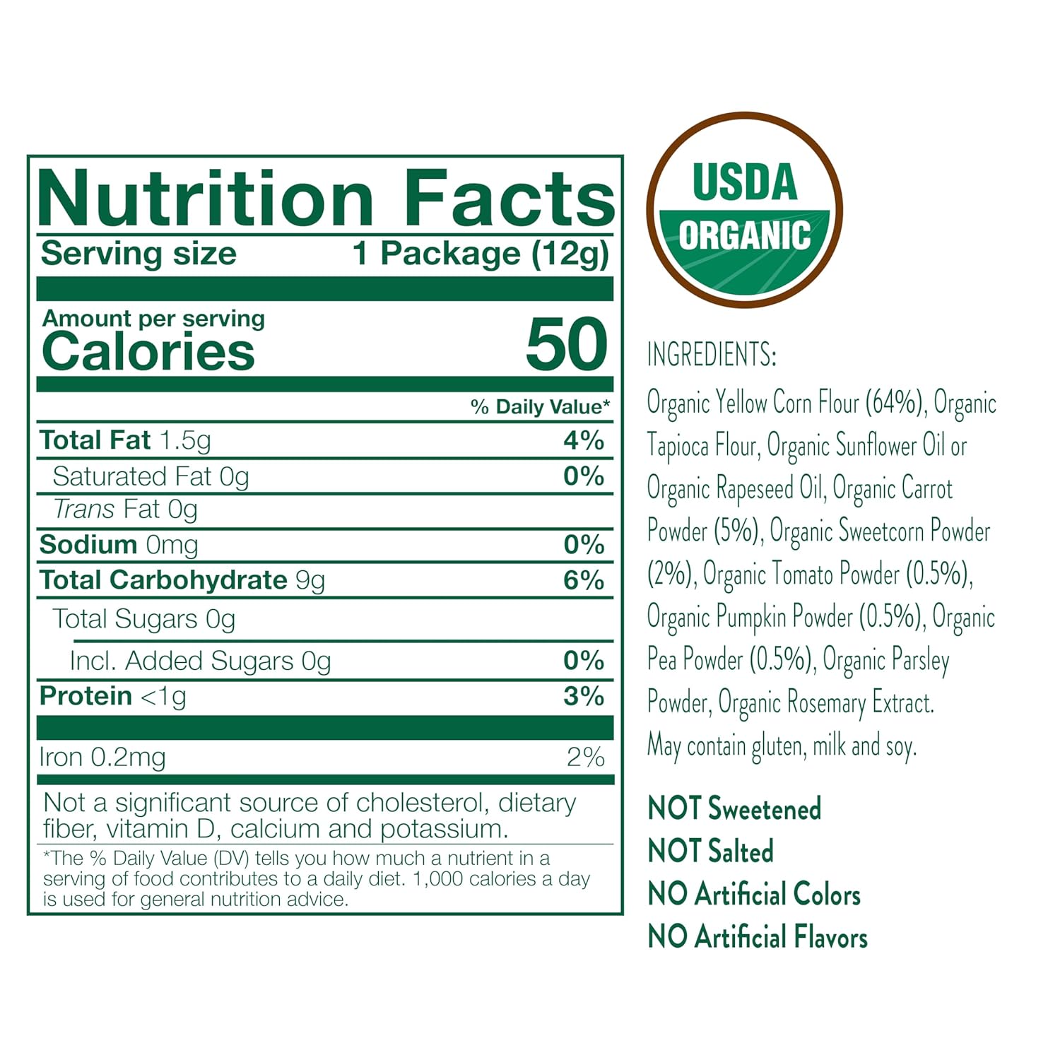 - Organic mixed veggie & corn tubes baked for a crunchier texture, introducing intrepid little adventurers to sensory explorations with new fun shapes & colors.