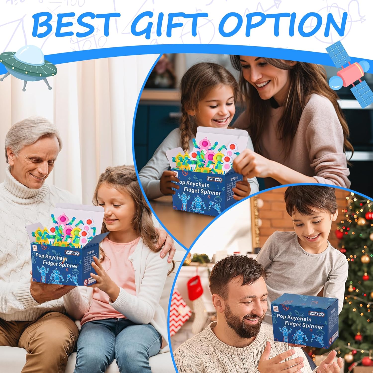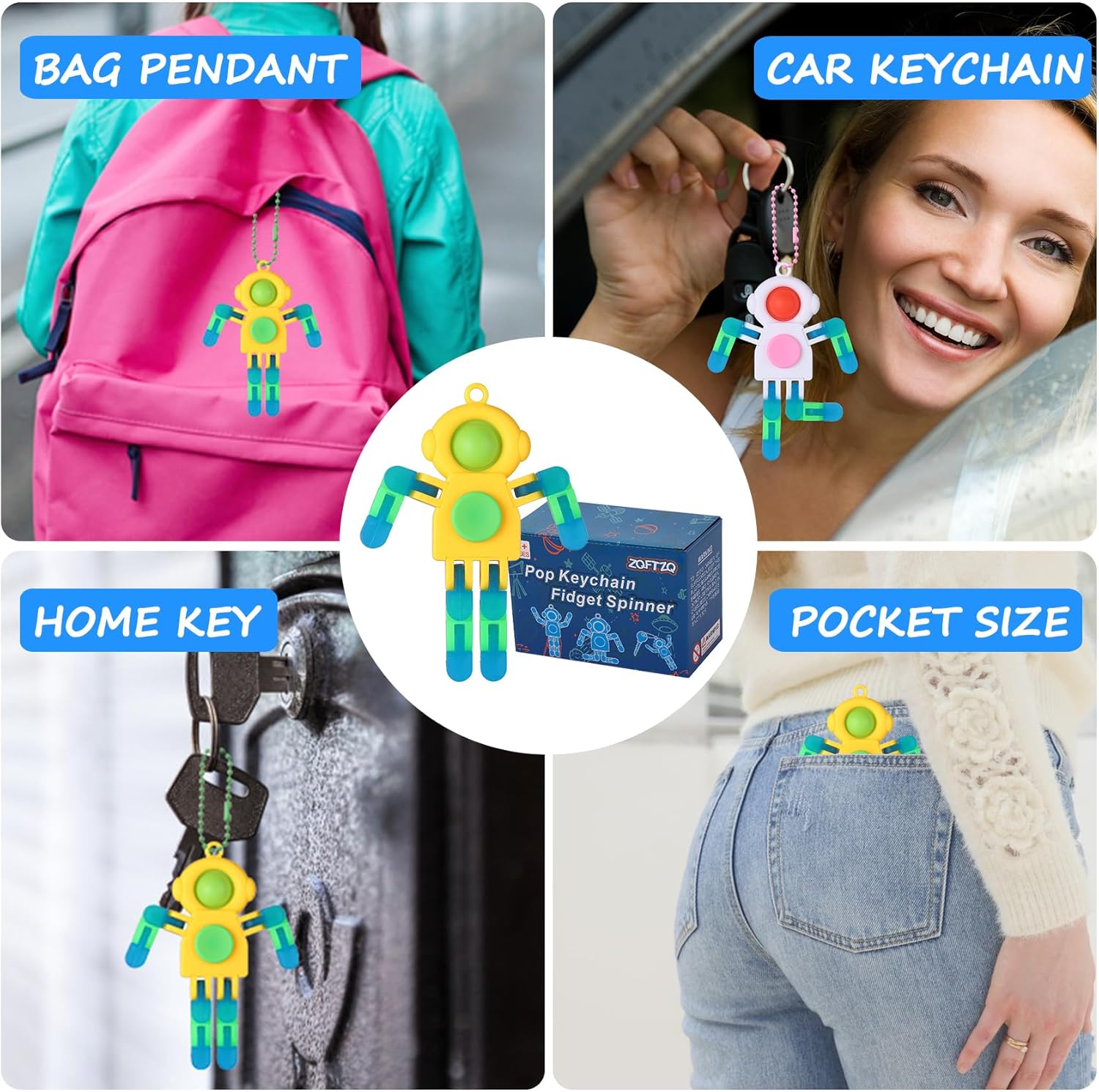 - Novelty Fidget Spinners: You will get 4 pieces luminous 3 in 1 fidget spinner keychain in one treasure box. With multiple ways to play -Rotate,squeeze pop,Change chain create shapes. Also you can hang them as key chain.