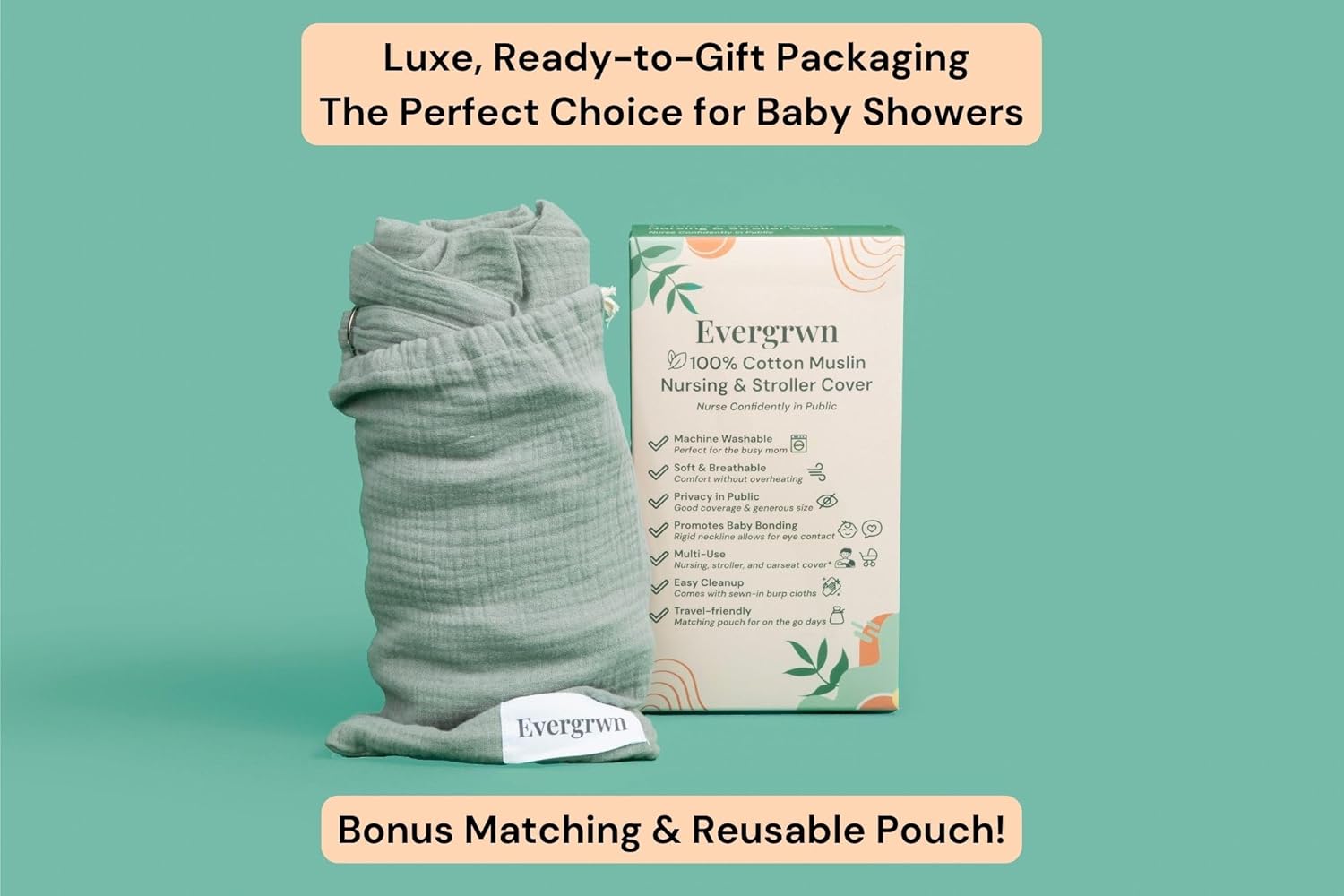 Superior Design Evergrwn Multi-use Privacy Nursing Cover Up for Breastfeeding, 100% Cotton Breathable Nursing Cover with Arch Neckline, Muslin Breastfeeding Cover, Baby Essentials (Sage Green)