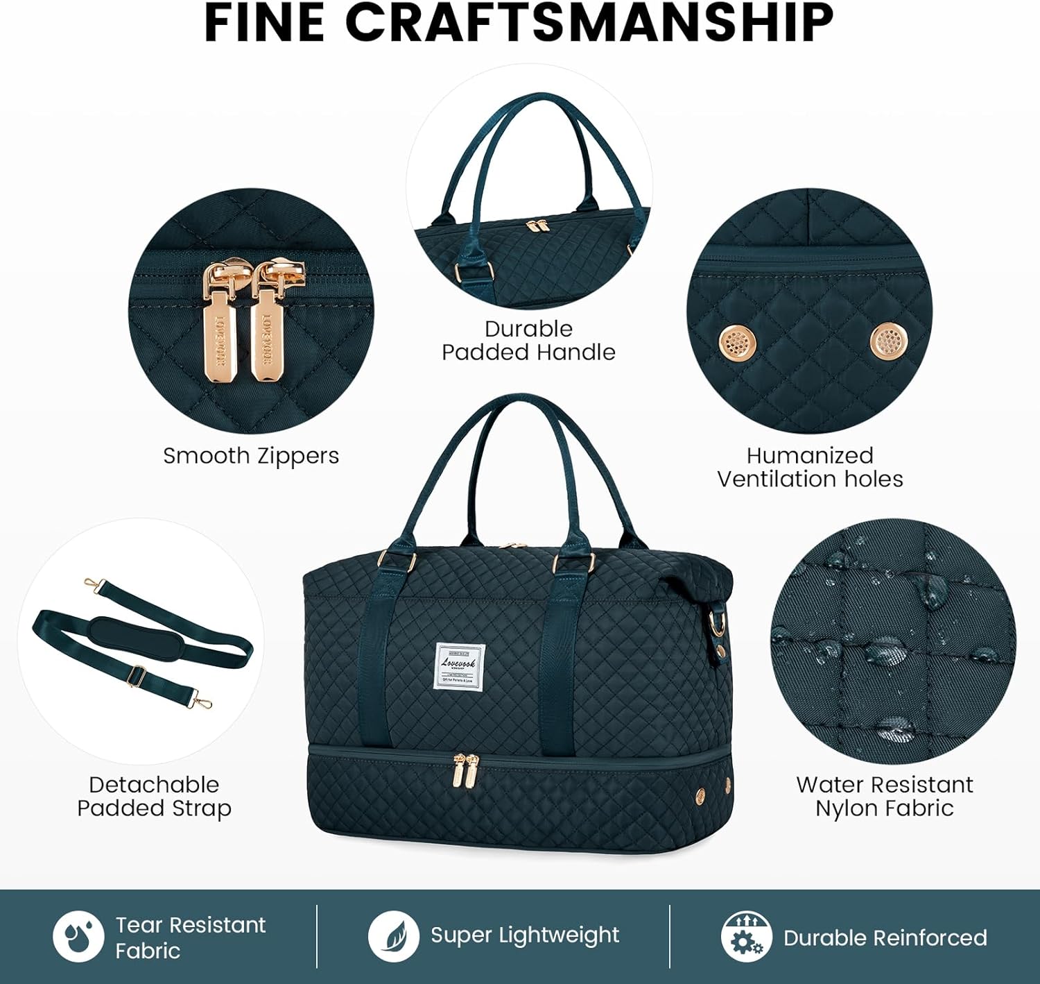 • 【TRAVEL TOTE BAG WITH SHOE COMPARTMENT+FREE SEPERATE TOILETRY BAG】This travel bags for women comes with a $15 toiletry bag to store your cosmetics/toiletries. Separate flat bottom compartment of this duffle bag women can hold your shoes or dirty clothes for easy separation from clean clothes when traveling.If you're a novice mother, the bottom part is also perfect for storing diapers/wipes/diaper bag items. It can also be used as a hospital bag,mommy bag and medical bag.