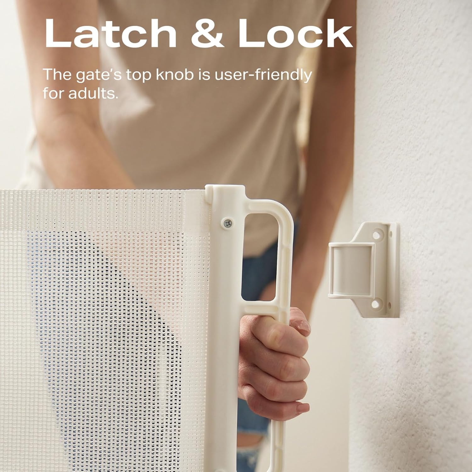 - New Safety Locking: The knob at the top of the mesh gate ensures that the retractable pet gate is easy to use for adults and can be opened and closed with one hand, while curious little ones and pets will not be able to make any naughty bids for freedom