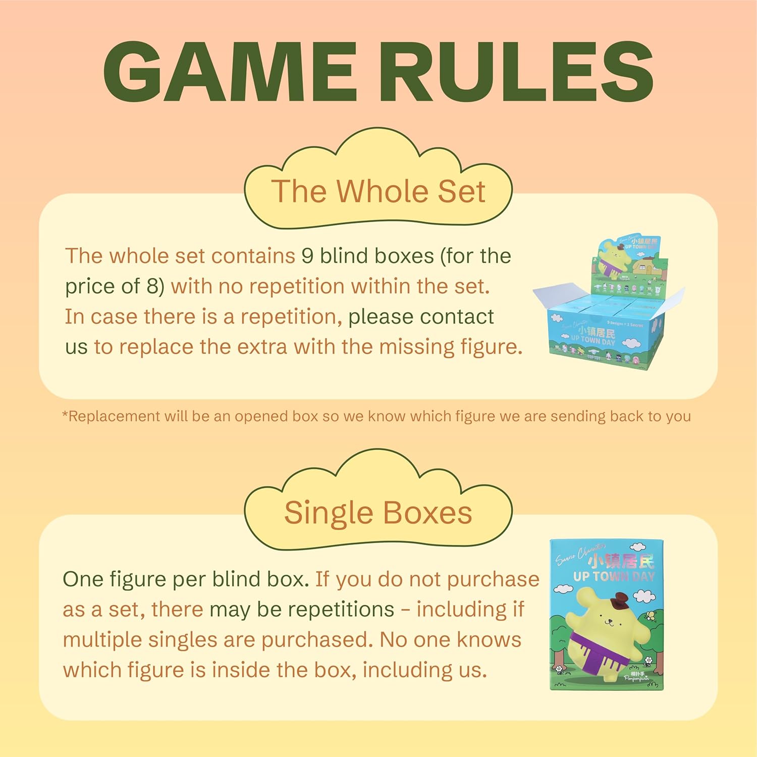 - Top Toy Up Town Day Blind Box Figures: All possible characters are shown on the first image, with the exception of the hidden character. The hidden character has a chance of appearing in any box.
