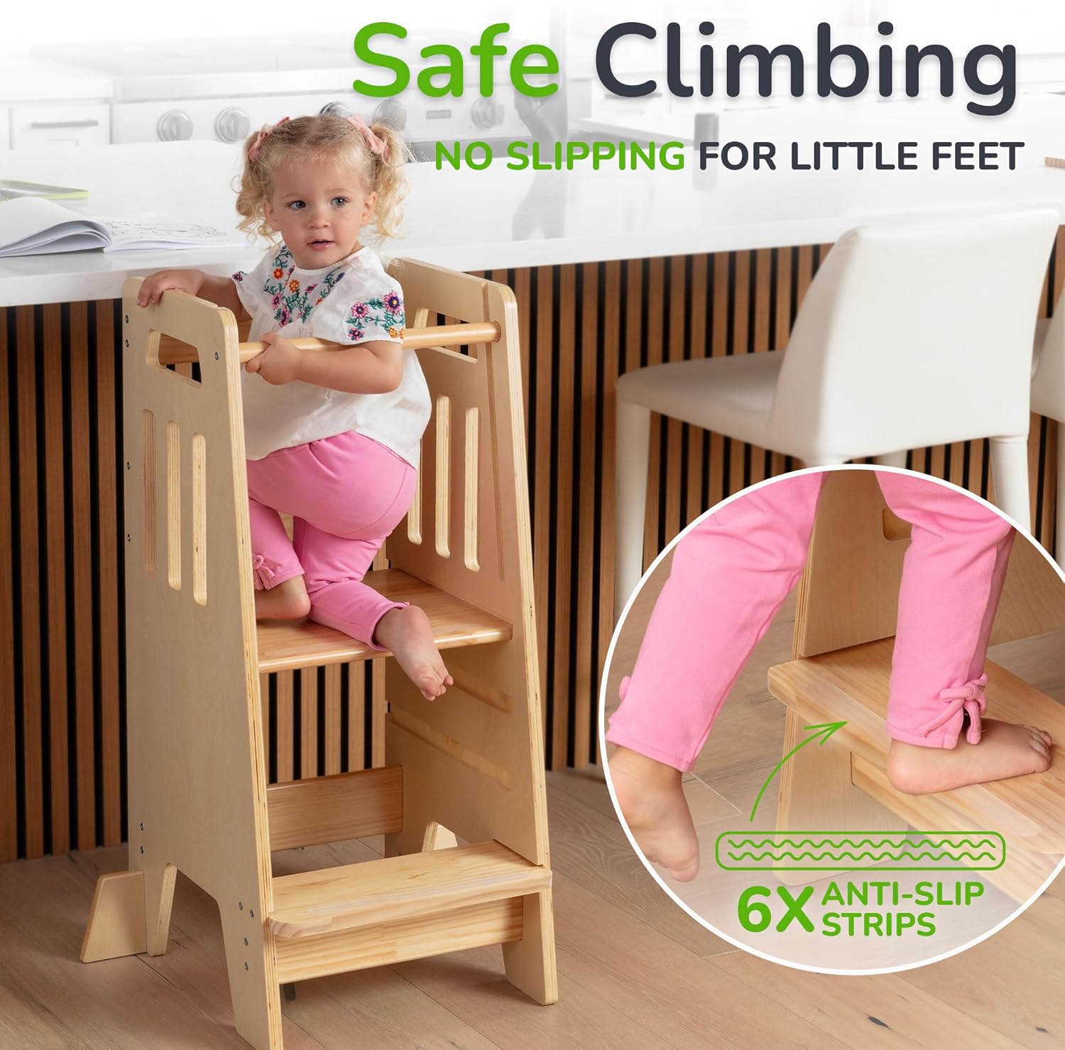 - Montessori-Inspired for Early Independence – Supports up to 150 lbs and fosters self-confidence through hands-on learning. Designed to help children safely take part in everyday routines, building real-world skills the Montessori way from an early age.