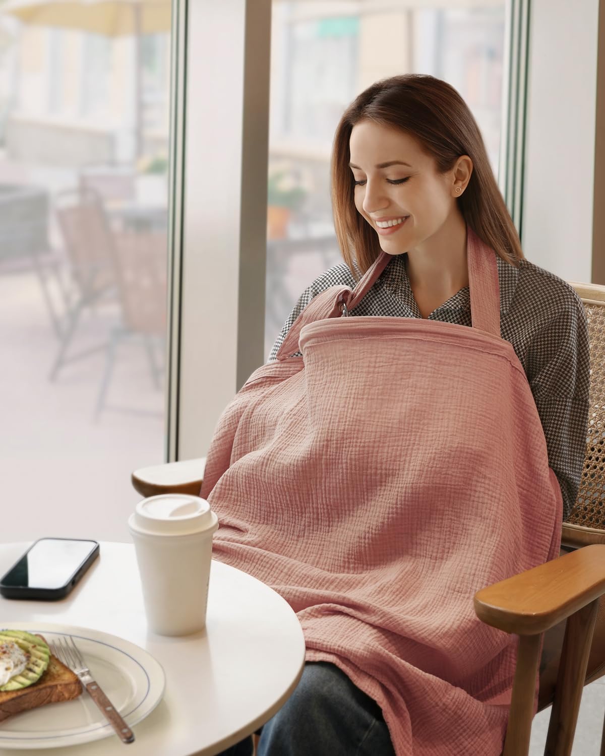 Blissful Diary Muslin Nursing Cover for Breastfeeding, Breathable Breastfeeding Cover up with Arch Neckline for Women, Nursing Apron (Dusty Pink)
