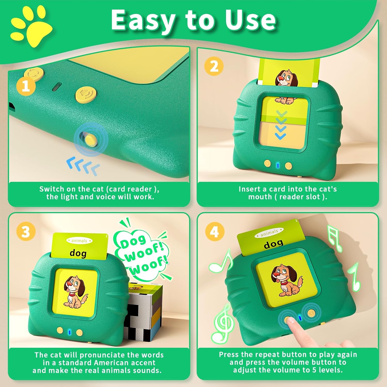 - [ Easy to Use ] - Just put the card into the cute cat machine s mouth ( card reader’s slot ),the American cat ( card reader ) will pronounce the words with a standard American accent. The card reader makes a real animal or vehicle’s sound When an animal card or vehicle card is inserted. There are also letters and numbers cards for preschool children and more cards for kindergarten children, your toddler can press the repeat button to repeat the pronunciation and sound, adjust volume to 5 levels.