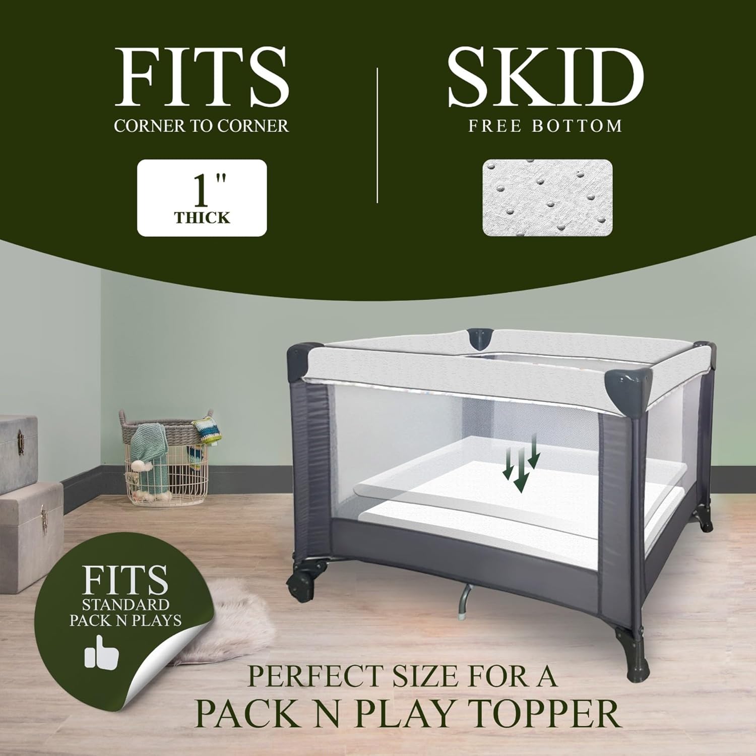 - WASHABLE & WATERPROOF PROTECTOR | Bonus Cover Eliminates Worry as Parents Keep Little Ones’ Bedding Fresh, Clean, Dry & Safe for Many Years To Come | Liner Prevents Liquid Mess From Damaging Pack & Play Floor—In Case of Accident, Simply Unzip, Remove & Toss in Washer & Dryer to Clean | Non-Skid Gripped Underside Stops Topper Pad from Moving & Slipping