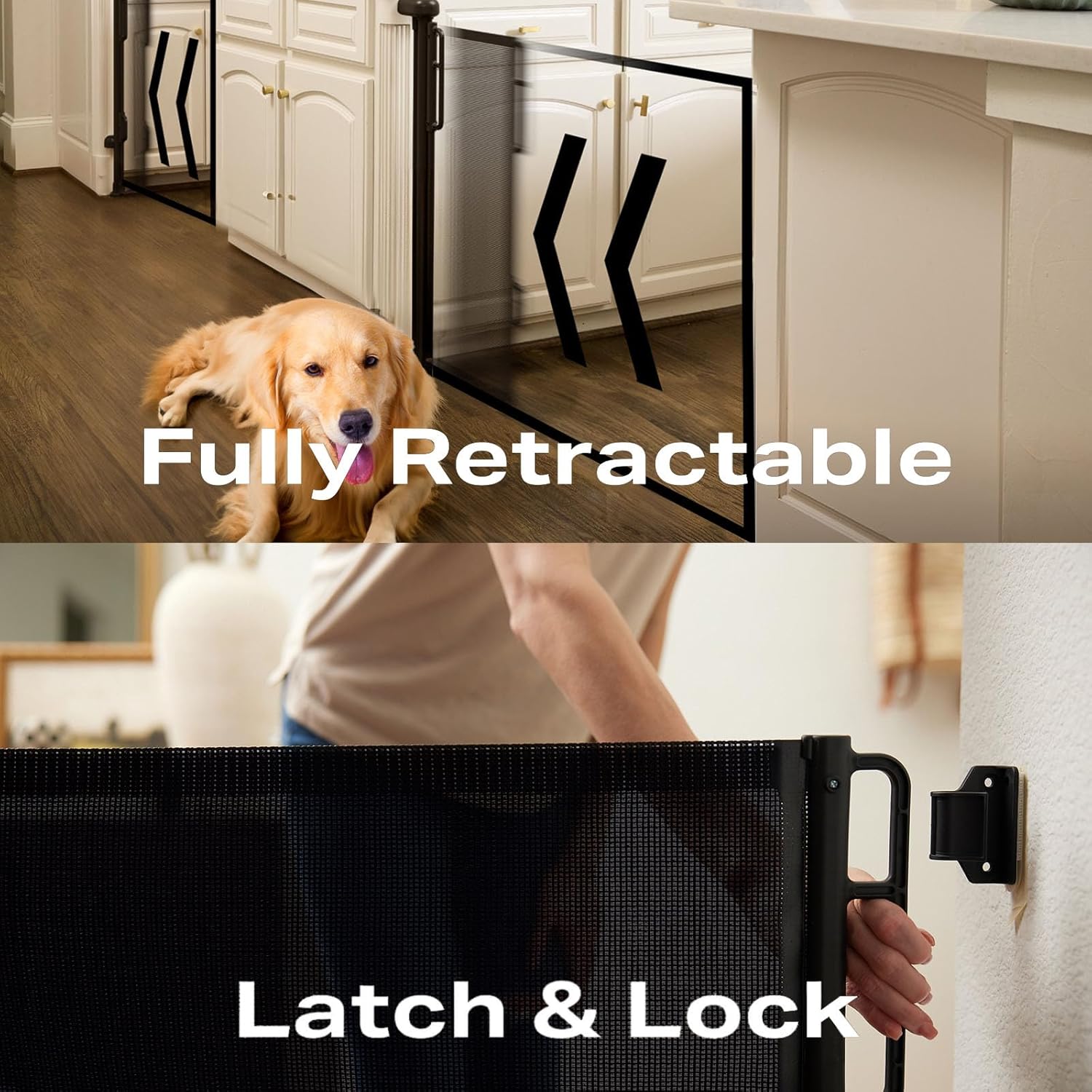 - New Safety Locking: The knob at the top of the mesh gate ensures that the retractable pet gate is easy to use for adults and can be opened and closed with one hand, while curious babies and pets will not be able to make any naughty bids for freedom. For best performance, remember to lock the latch after installation to fully tighten the mesh and ensure stability.